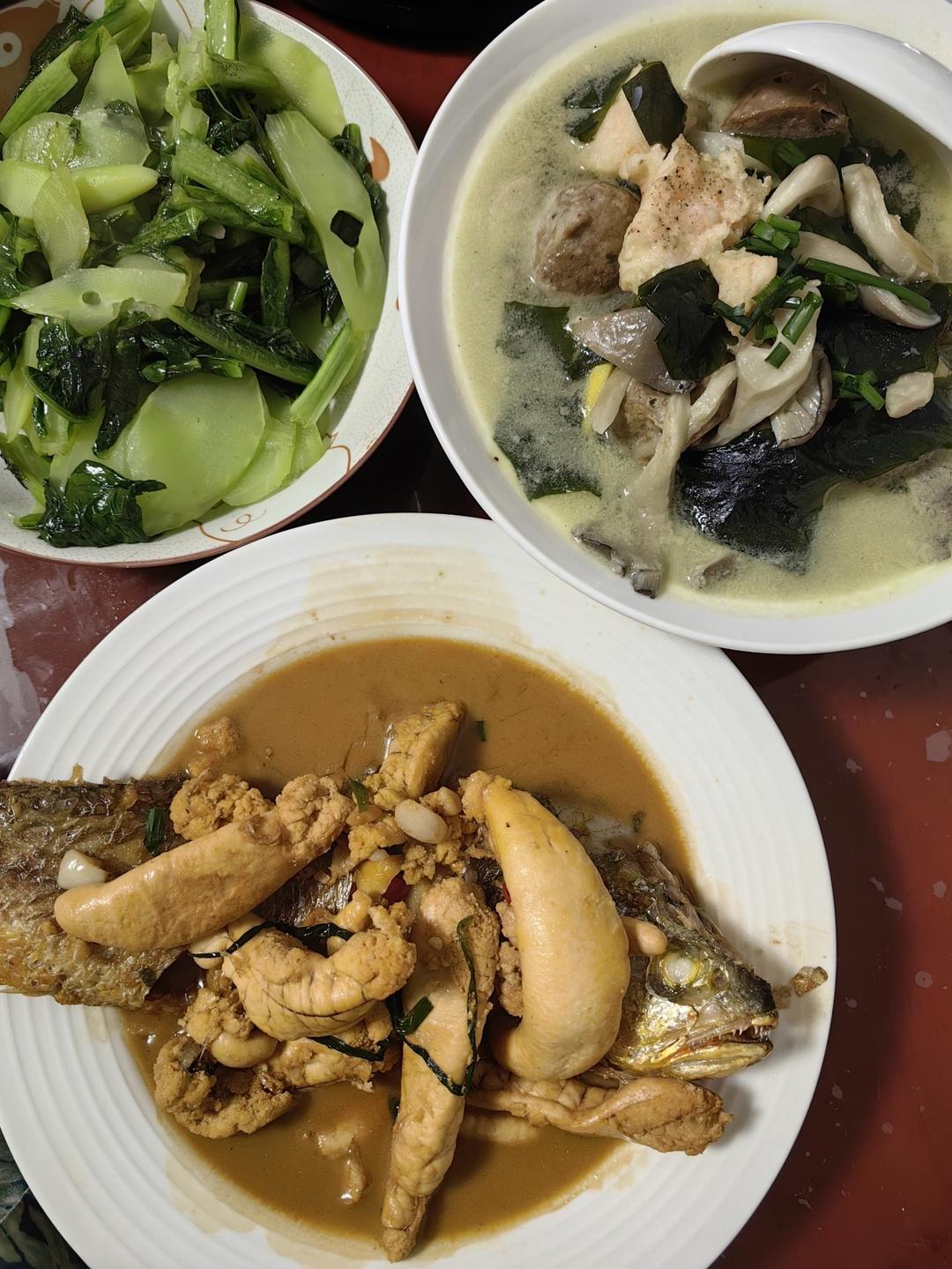 红烧黄鱼及鱼籽,平菇裙带菜汤,清炒莴笋