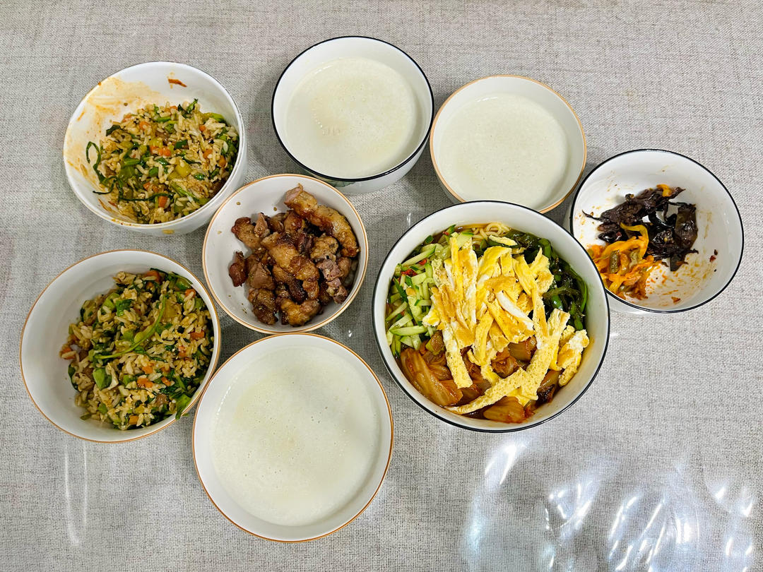 中午吃的昨天的脊骨汤饭,晚上给父子俩做的炒饭,我自己做的温面,太忙活了,洗了不少锅和碗。