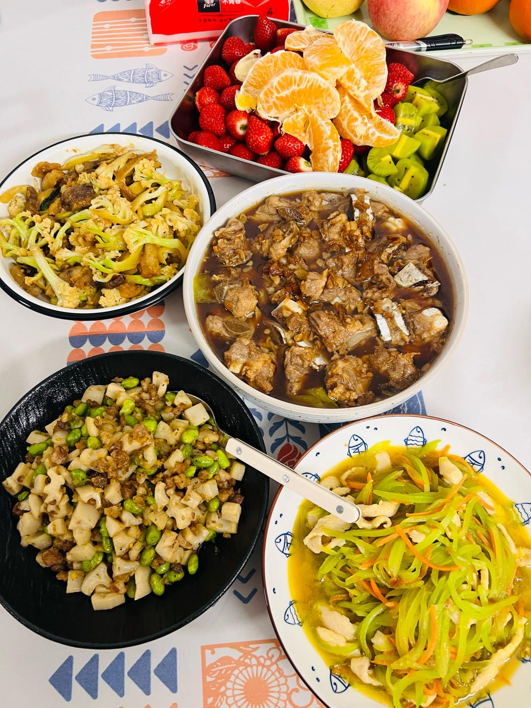 猪油渣炒松花菜,丝瓜蒸排骨,肉沫毛豆炒脆藕,莴笋胡萝卜炒鸡胸肉,草莓猕猴桃粑粑柑