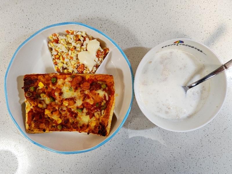 奥尔良鸡肉披萨,鸡蛋胡萝卜沙拉,牛奶麦片