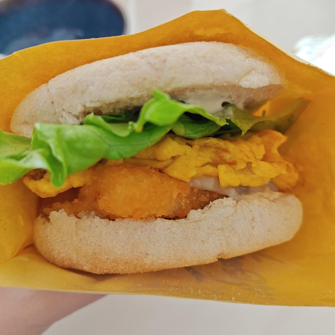 山姆的麦芬和鳕鱼排,配球生菜和滑蛋,棒