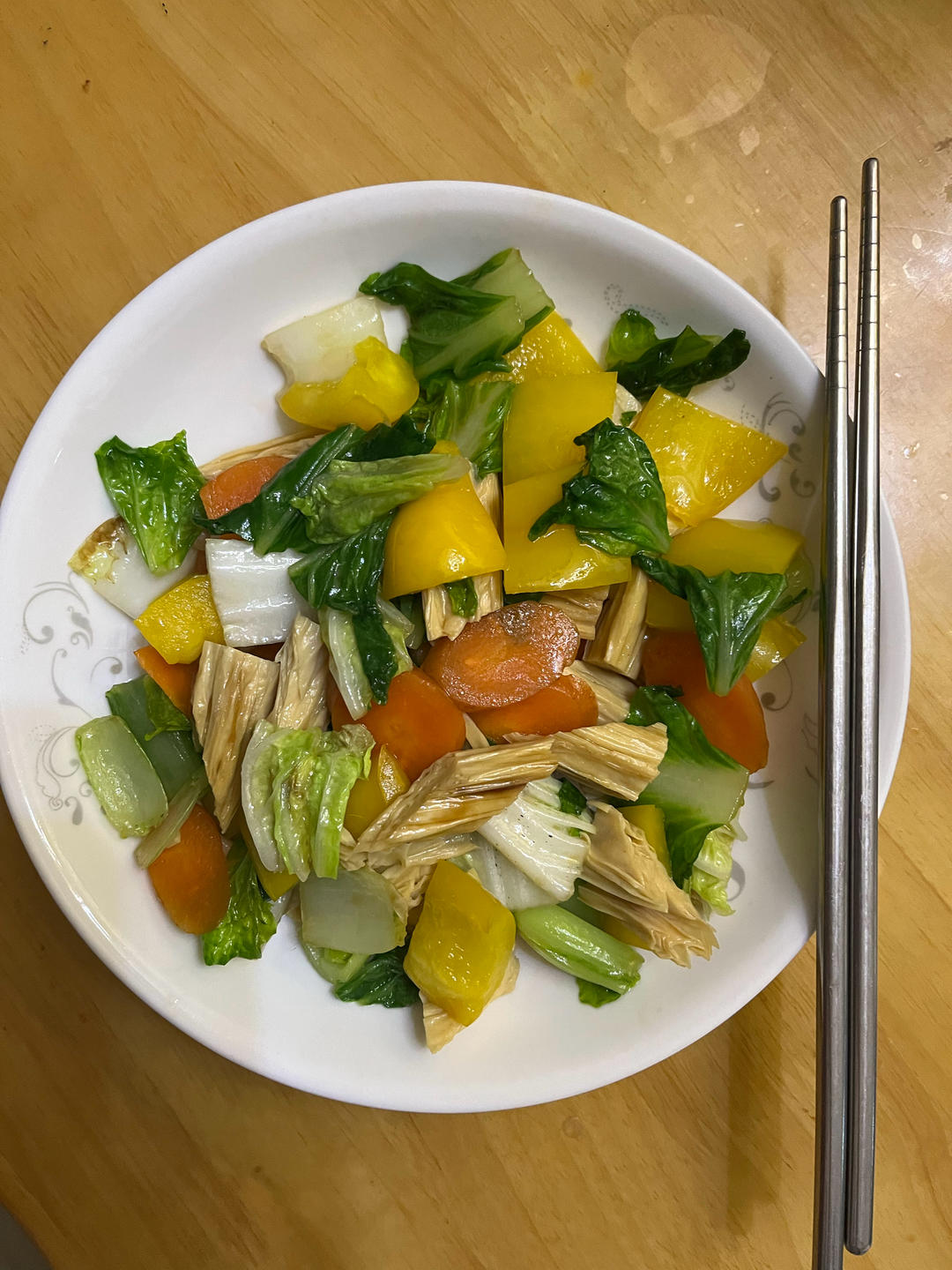 蔬菜杂炒,出来的配色还挺好看,黄彩椒、奶白菜、胡萝卜、腐竹