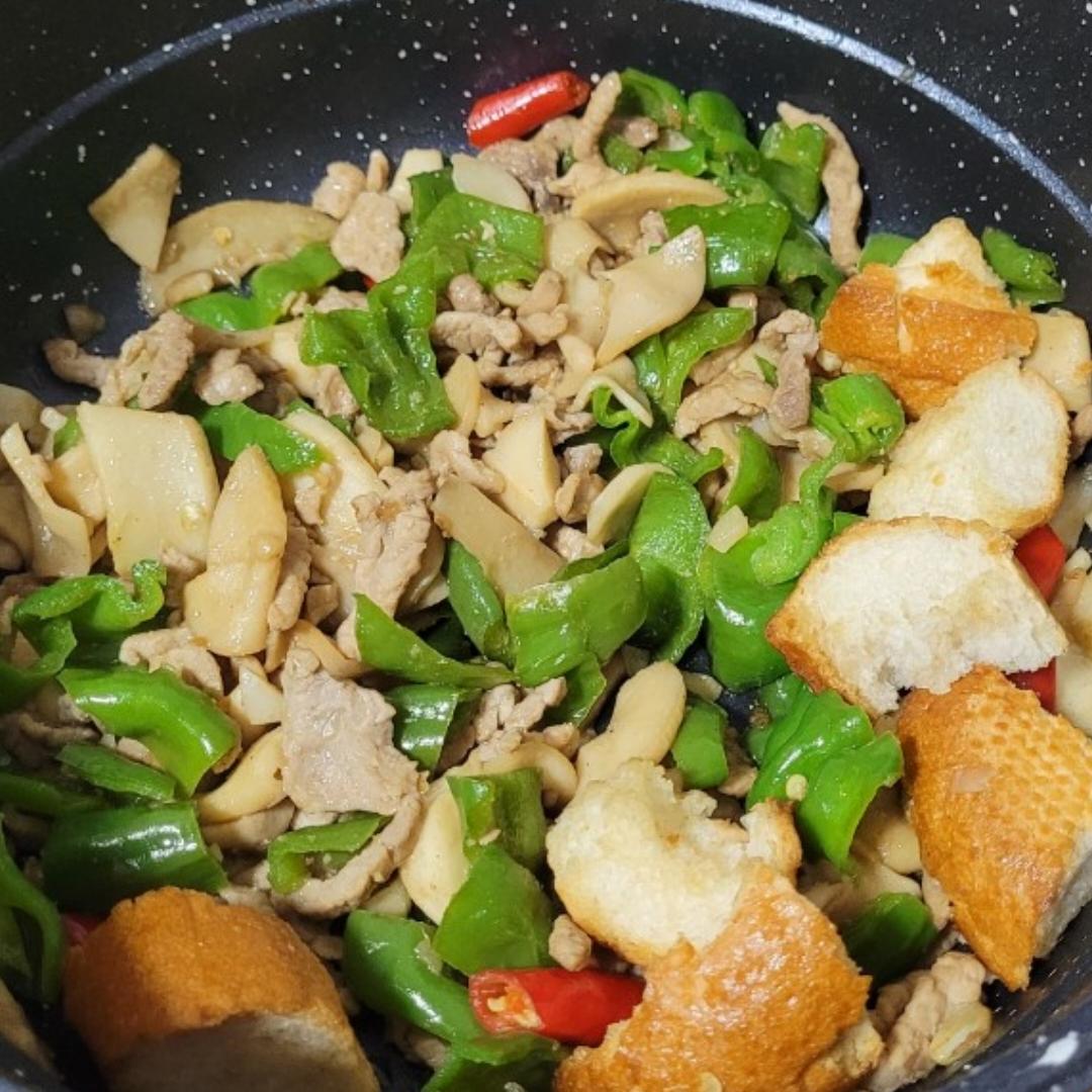 青椒杏鲍菇炒肉(黄色的是法棍🥖)
