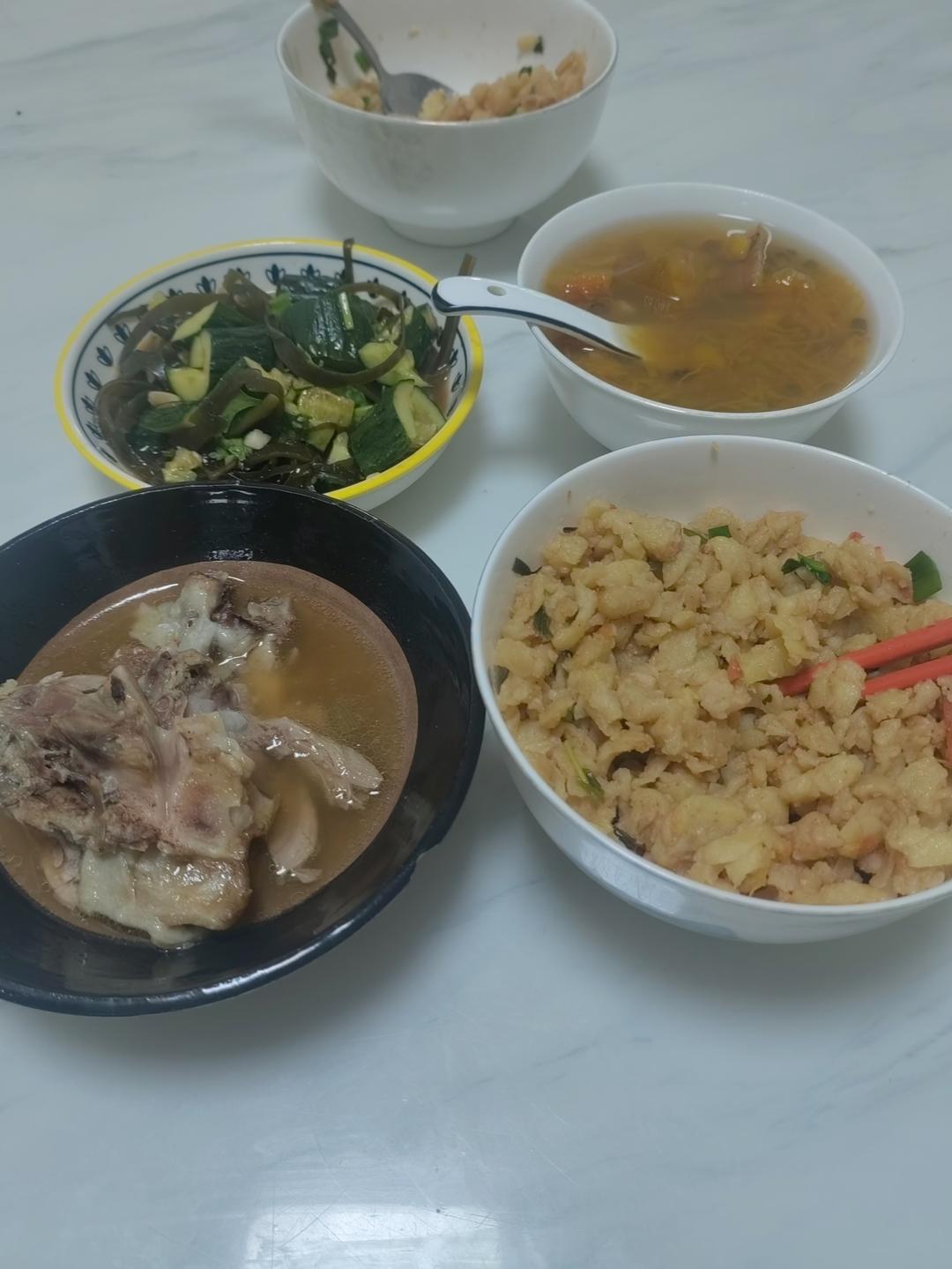 炒洋芋擦擦,猪肘肉,凉菜,南瓜绿豆粥。