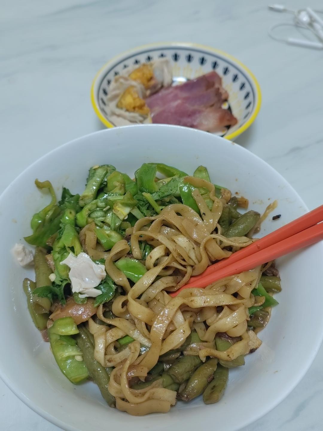豆角焖面,换做了老虎菜,牛肉,咸鸭蛋。