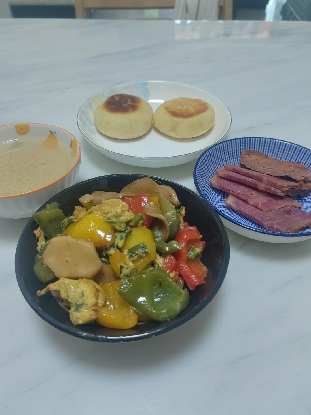 彩椒炒鸡蛋,牛肉,稠酒,红糖饼,自己做的红糖饼,流心。