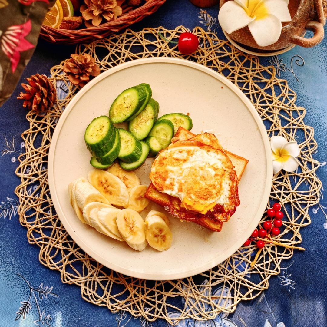 黄瓜,香蕉,面包和煎蛋。