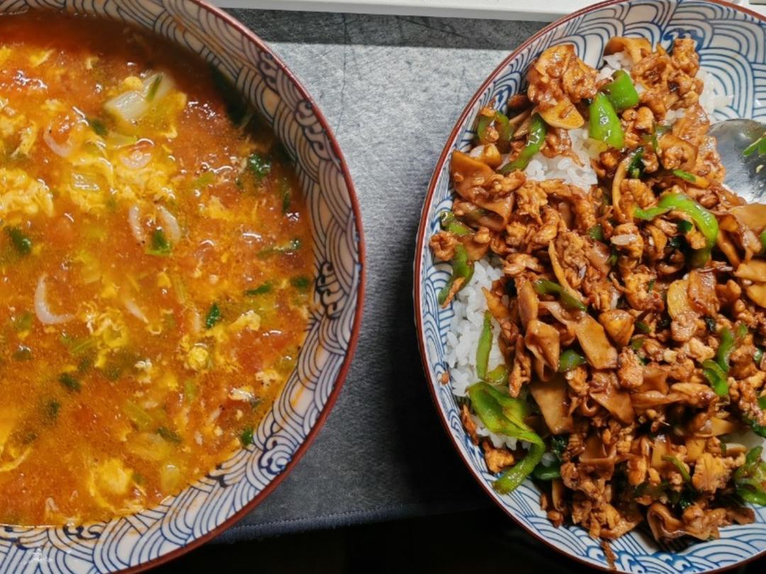 番茄鸡蛋汤+辣椒炒肉