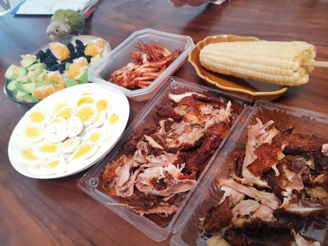 烤鸡煮鸡蛋鱿鱼须牛油果玉米桑葚耙耙柑