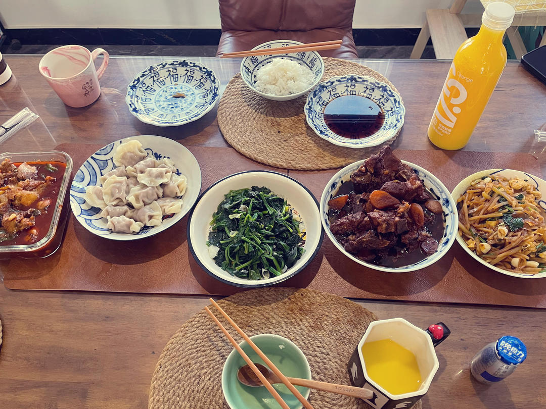 今日午餐,小年吃饺子🥟,吃鸡大吉大利,吃排骨,吃菠菜百财。土豆炒鸡蛋团团圆圆。