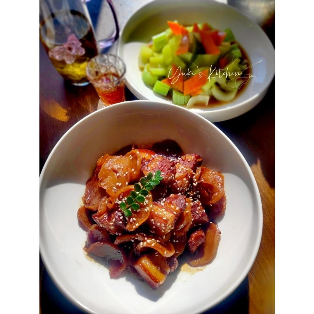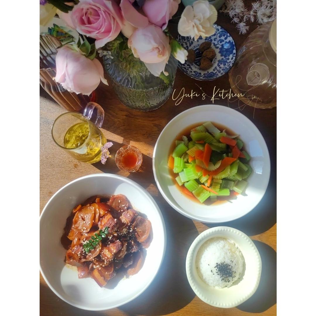可乐卤肉饭,配方减半,里面没说加水,应该加一点水,有一点咸,稍微减一点生抽,不减也可。两个人,一次性纸杯的米,再加个凉拌...