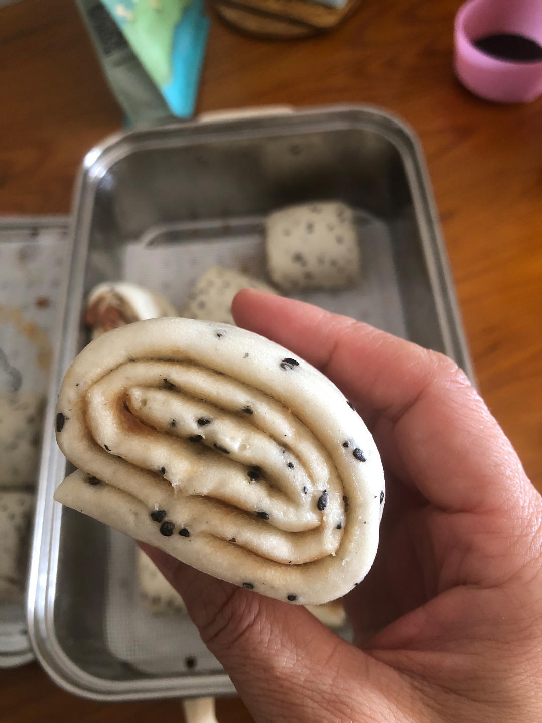 照方子做的馒头完美😍水量调为280 g,加了30 g黑芝麻,夹层涂了芝麻花生酱