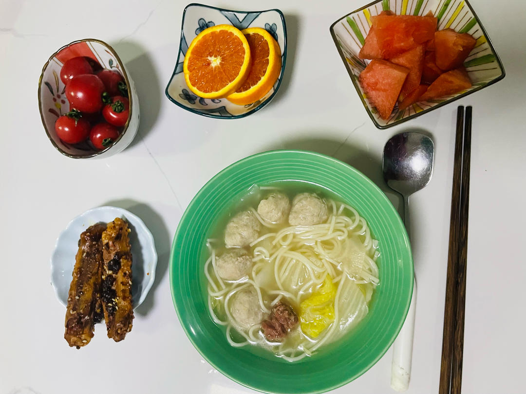 肉丸白菜萝卜牛肉面、辣鸭翅、西瓜、血橙、樱桃小柿子