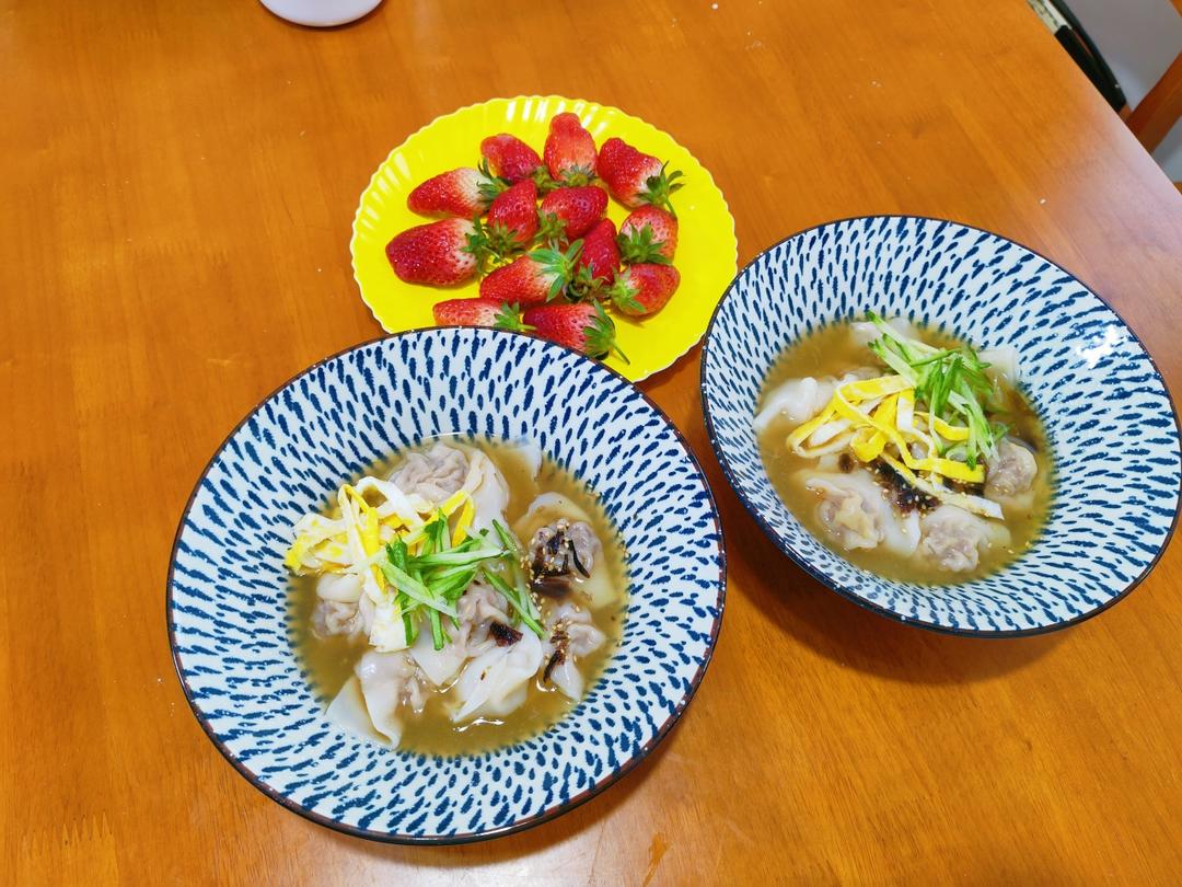 今日两个小学生的早饭,猪肉虾仁馄饨,每娃11个。
