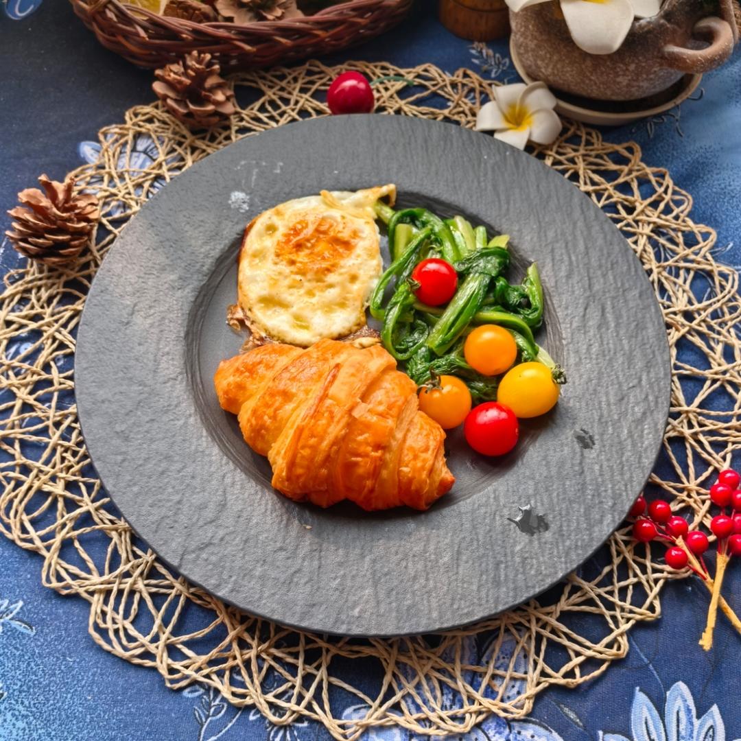 原味可颂,煎蛋,清炒油麦菜和小番茄。