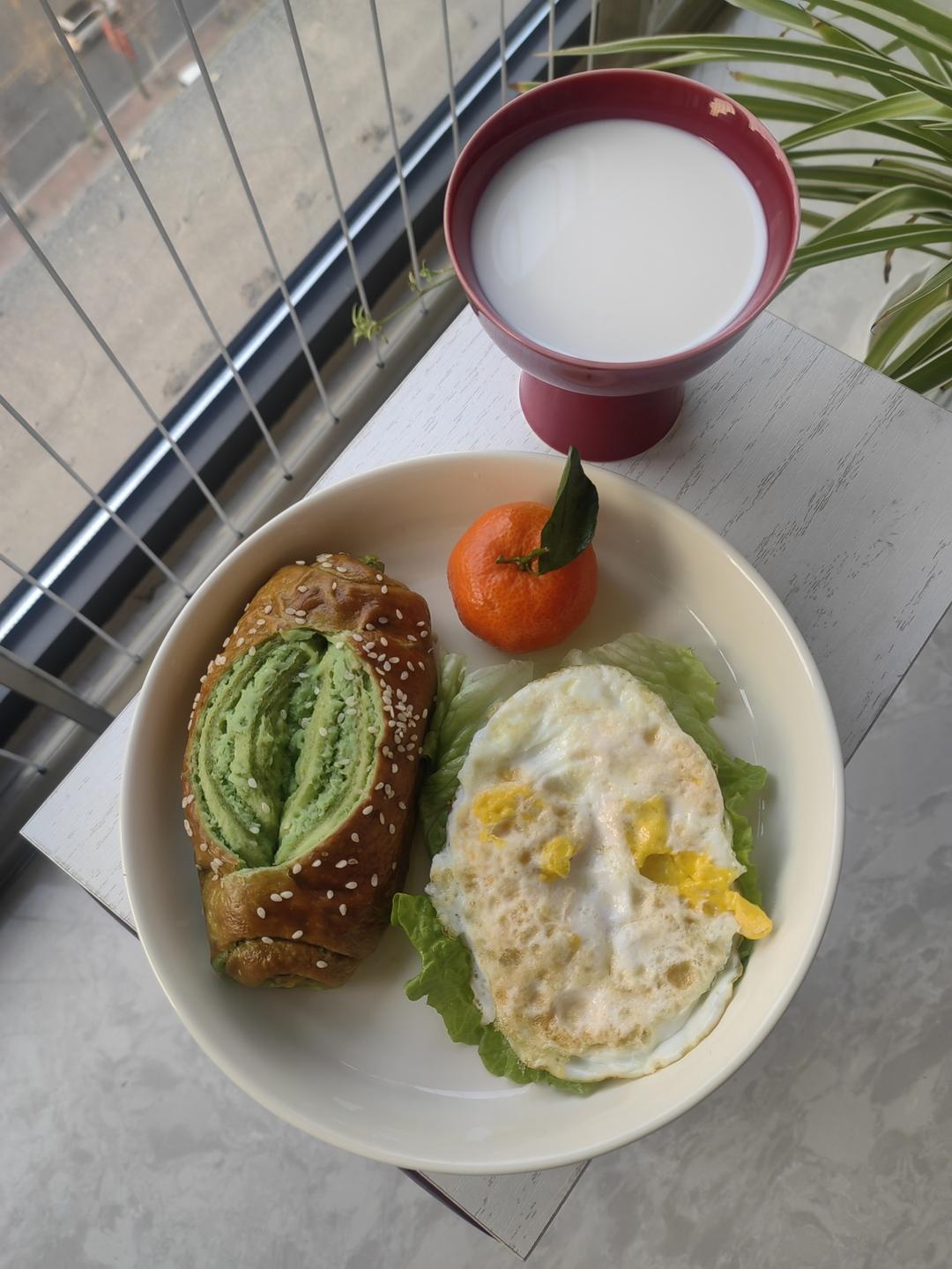 牛奶🥛+开心果碱水棒🥯+煎鸡蛋🍳+沙糖桔🍊