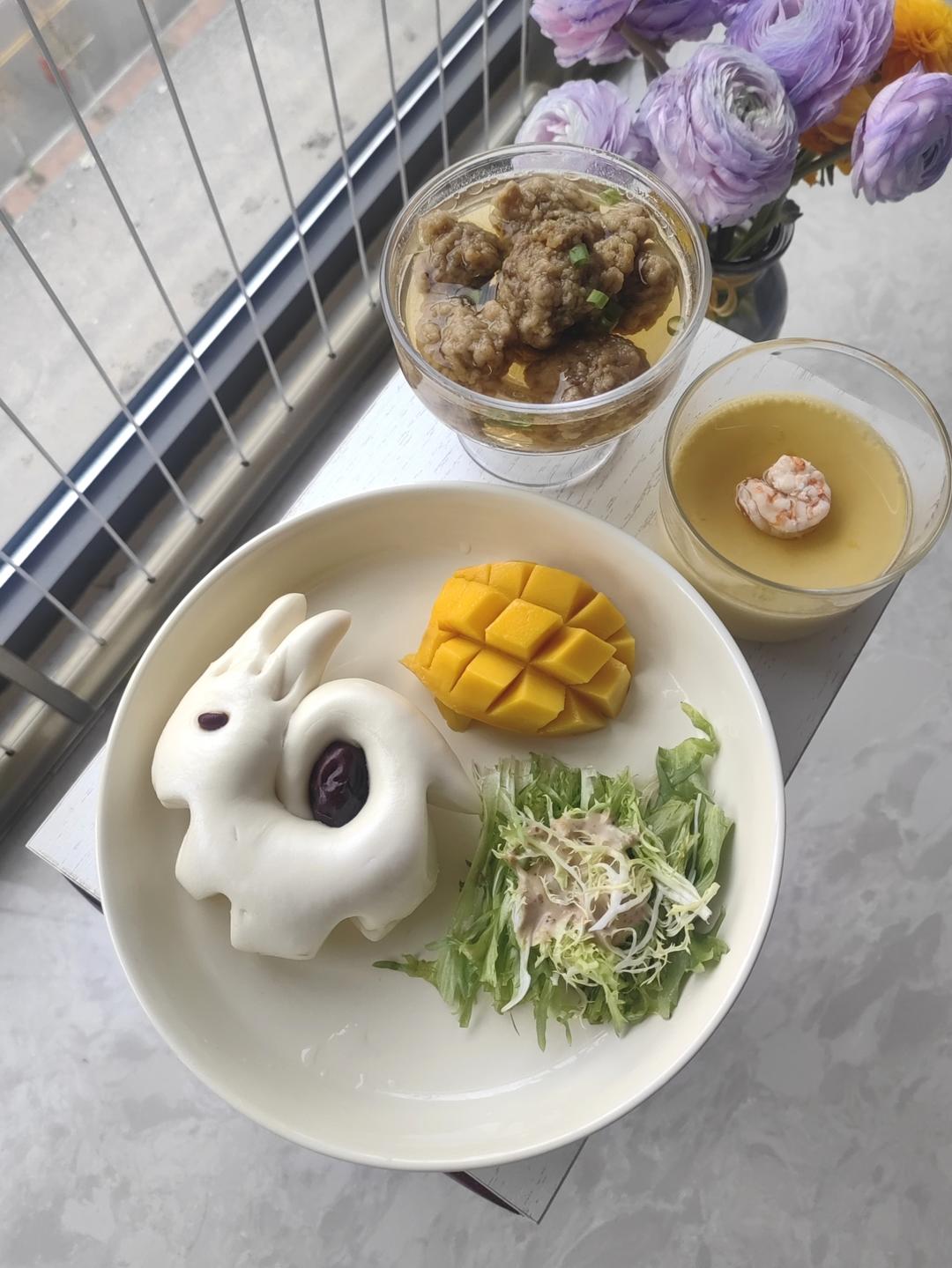 丸子汤🥣+枣馍🍥+蒸蛋羹🍮+苦菊🥗+芒果🥭