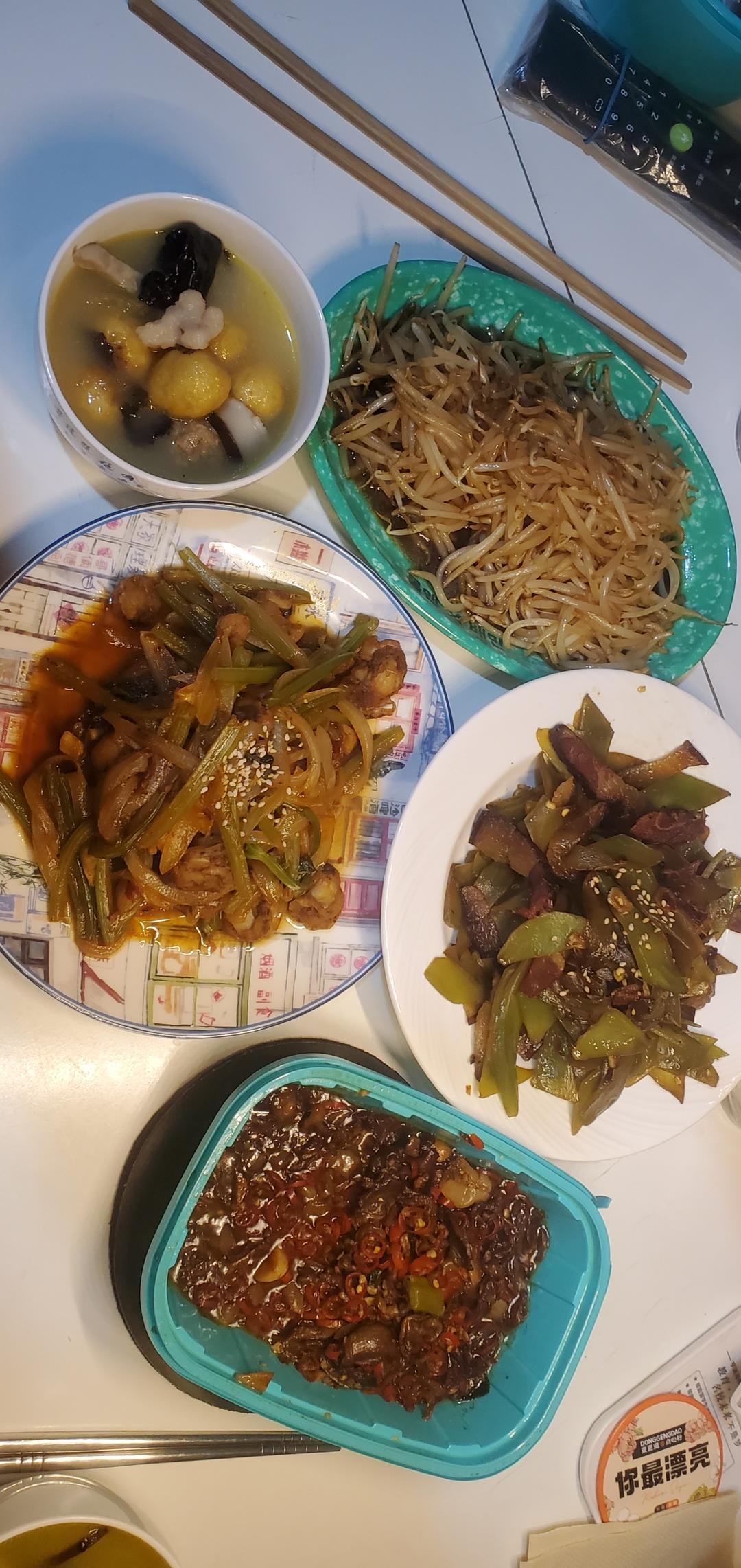久违了,工作日晚餐家常便饭满汉全席。以为做多了但还是光盘了,成功。腊肉片炒莴笋片+香辣扇贝肉+开胃酸辣豆芽。还有外卖剩的...