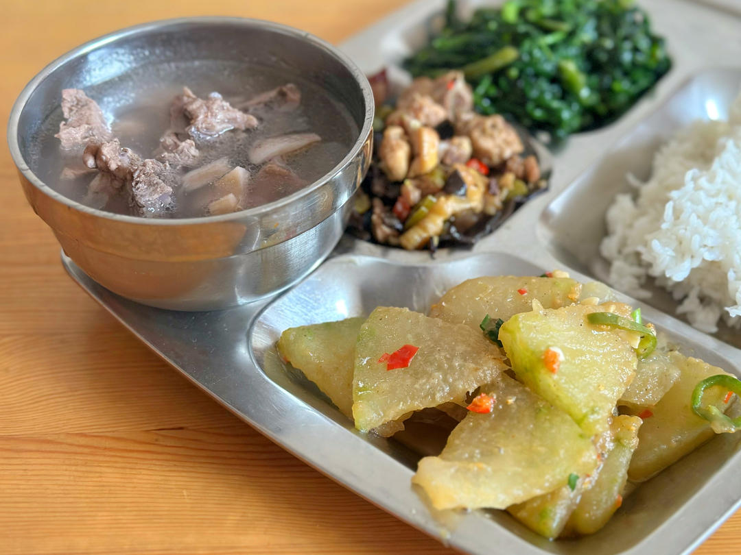 本来不想去吃食堂的,但是今天的菜英国乡下不太容易买到,太辣的菜都没要,就要了酸辣椒木耳炒鸡,红烧冬瓜,清炒茼蒿和莲藕排骨...