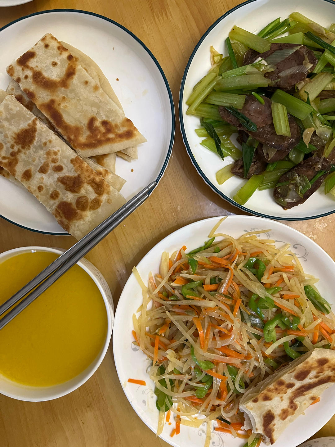 烙饼+土豆丝+腊肠炒芹菜+南瓜米糊