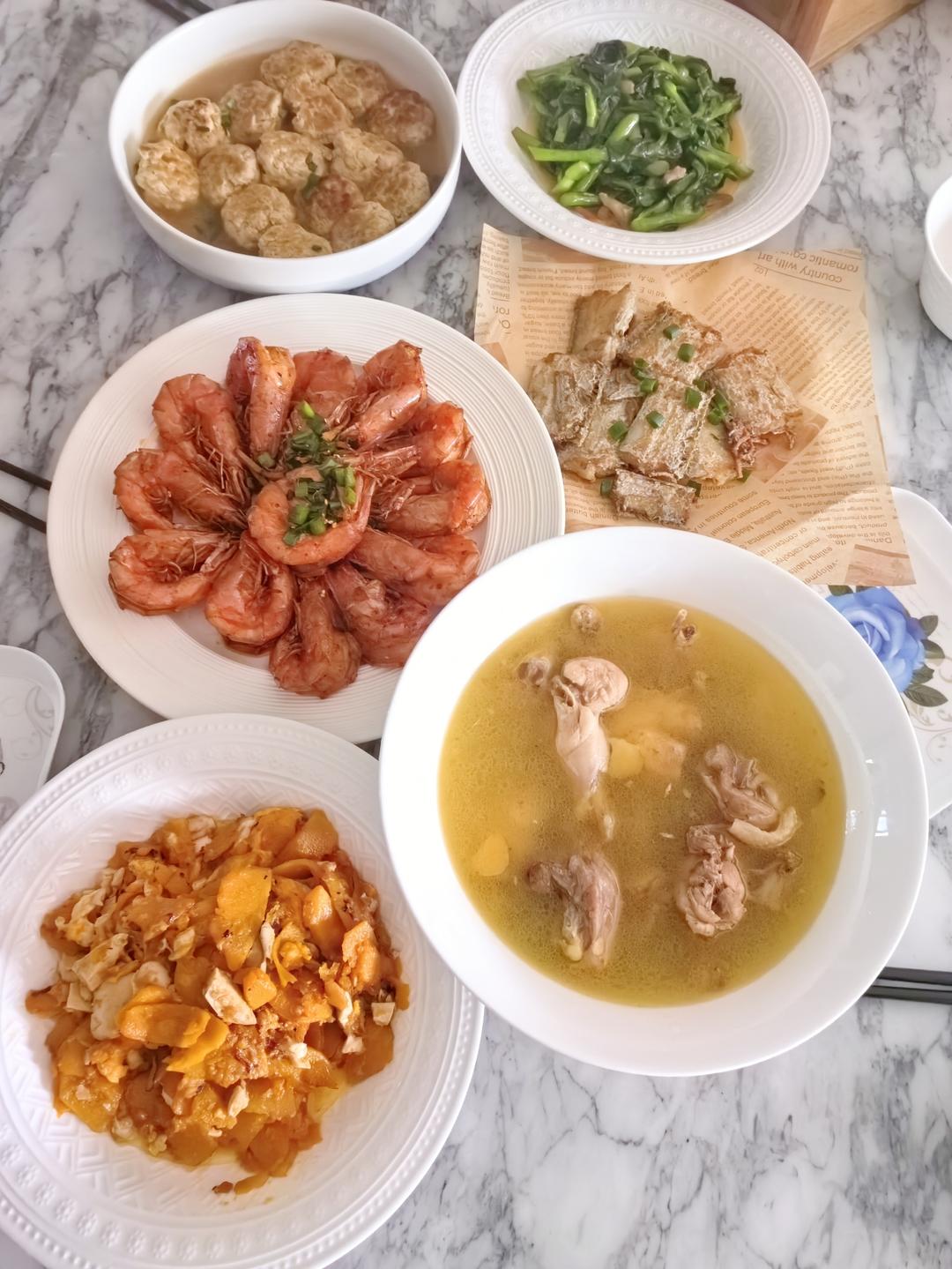 香煎黄鲳鱼,韭黄炒蛋,上汤豆苗
