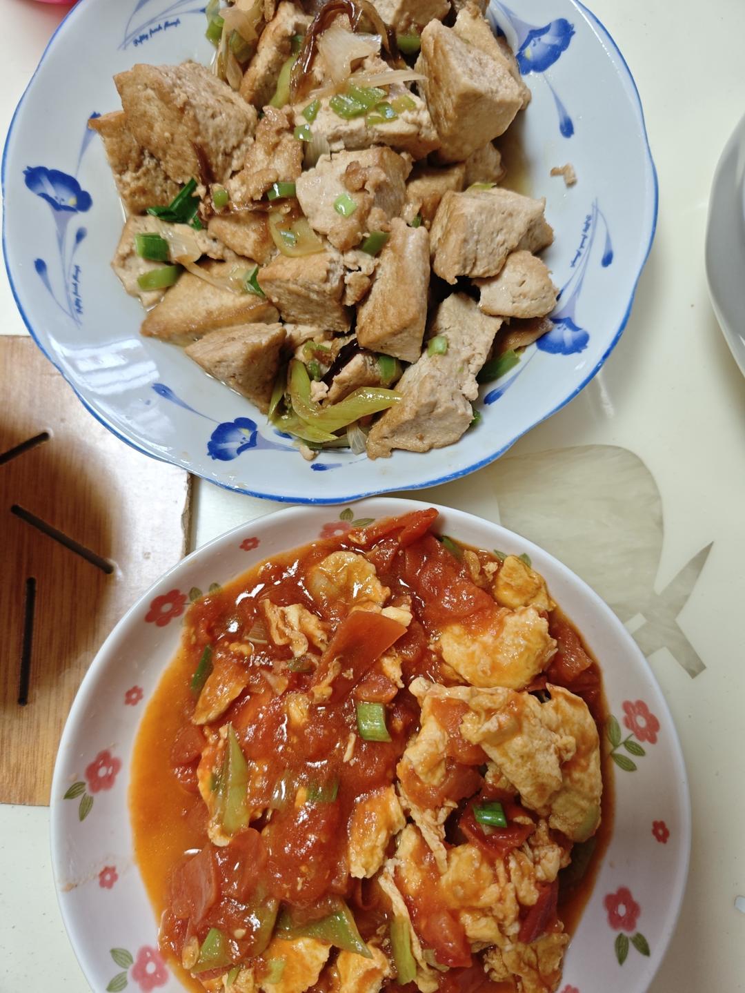 西红柿炒鸡蛋,炒豆腐,杂粮米饭😄