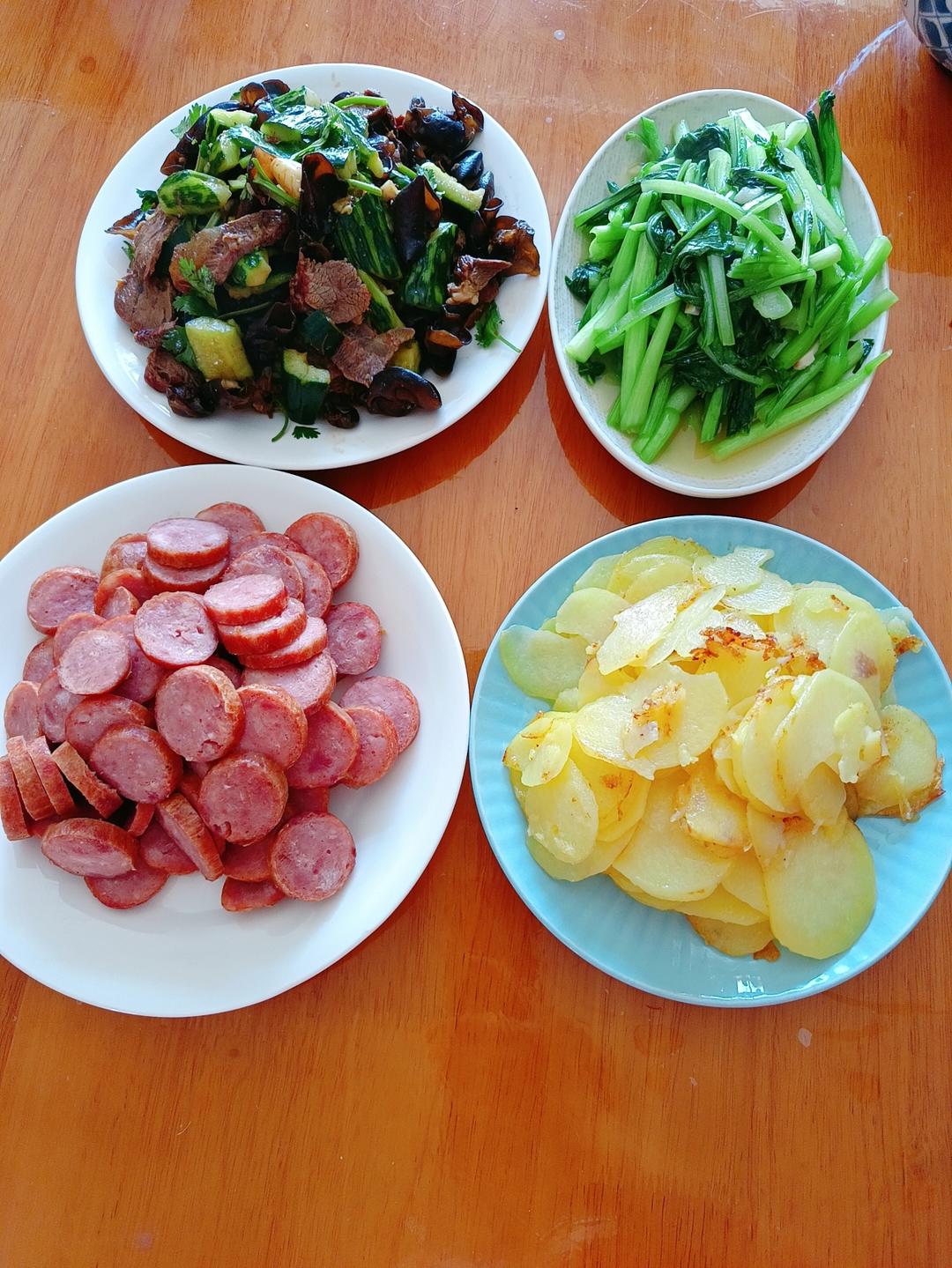 红肠,土豆片,搅拌牛肉,炒青菜