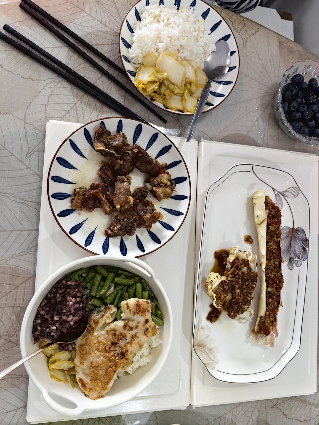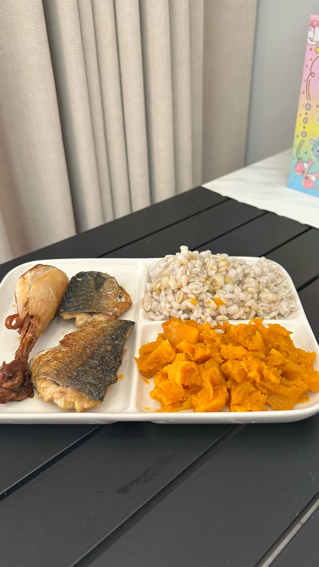卤鸡腿(去皮)+煎青花鱼+蒸南瓜+青稞饭