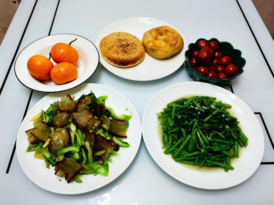 芹菜炒腊肉,蒜蓉空心菜,炸菜盒,芝麻烧饼🍊🍅