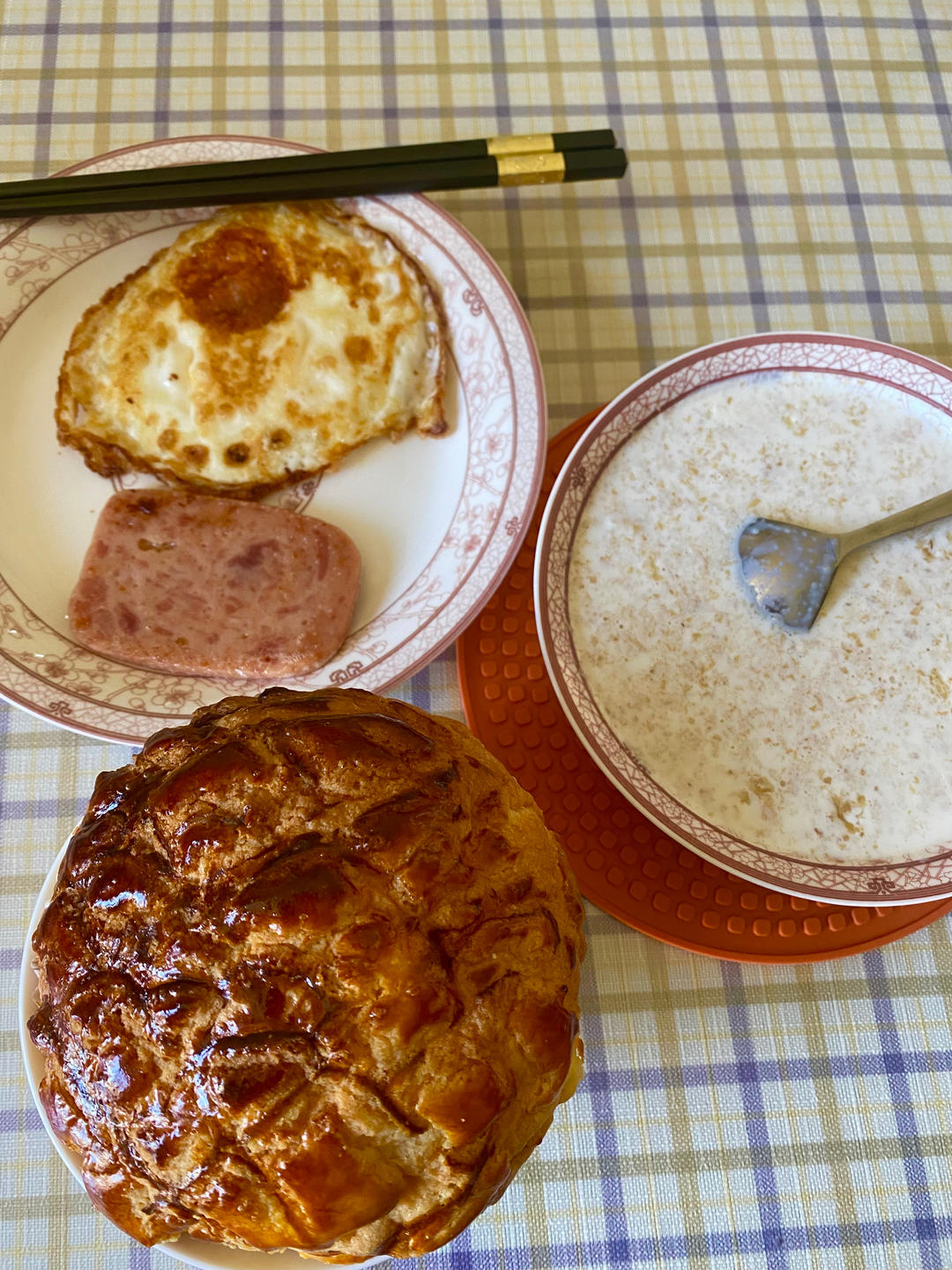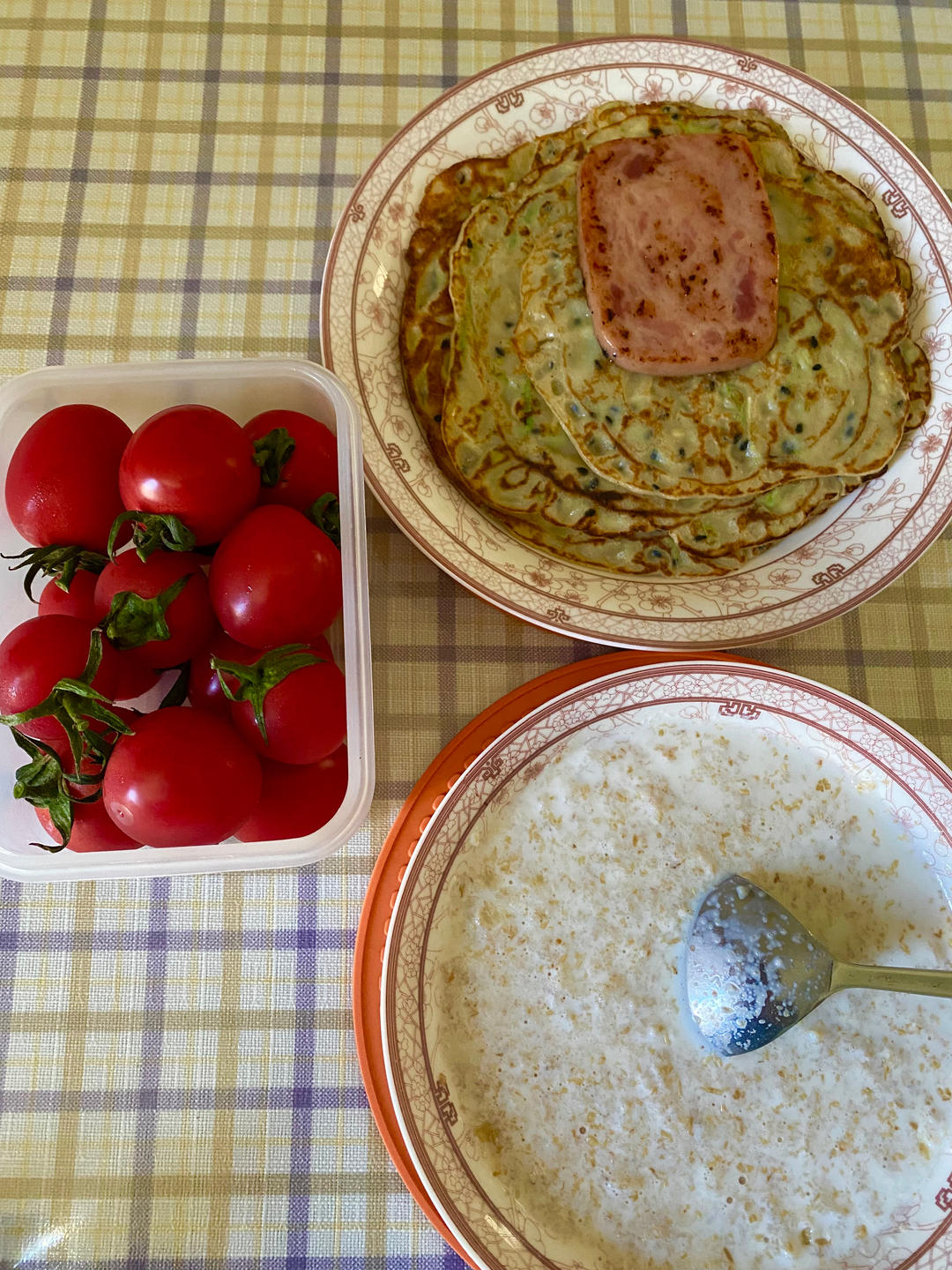 西葫芦鸡蛋饼,煎火腿,牛奶燕麦粥