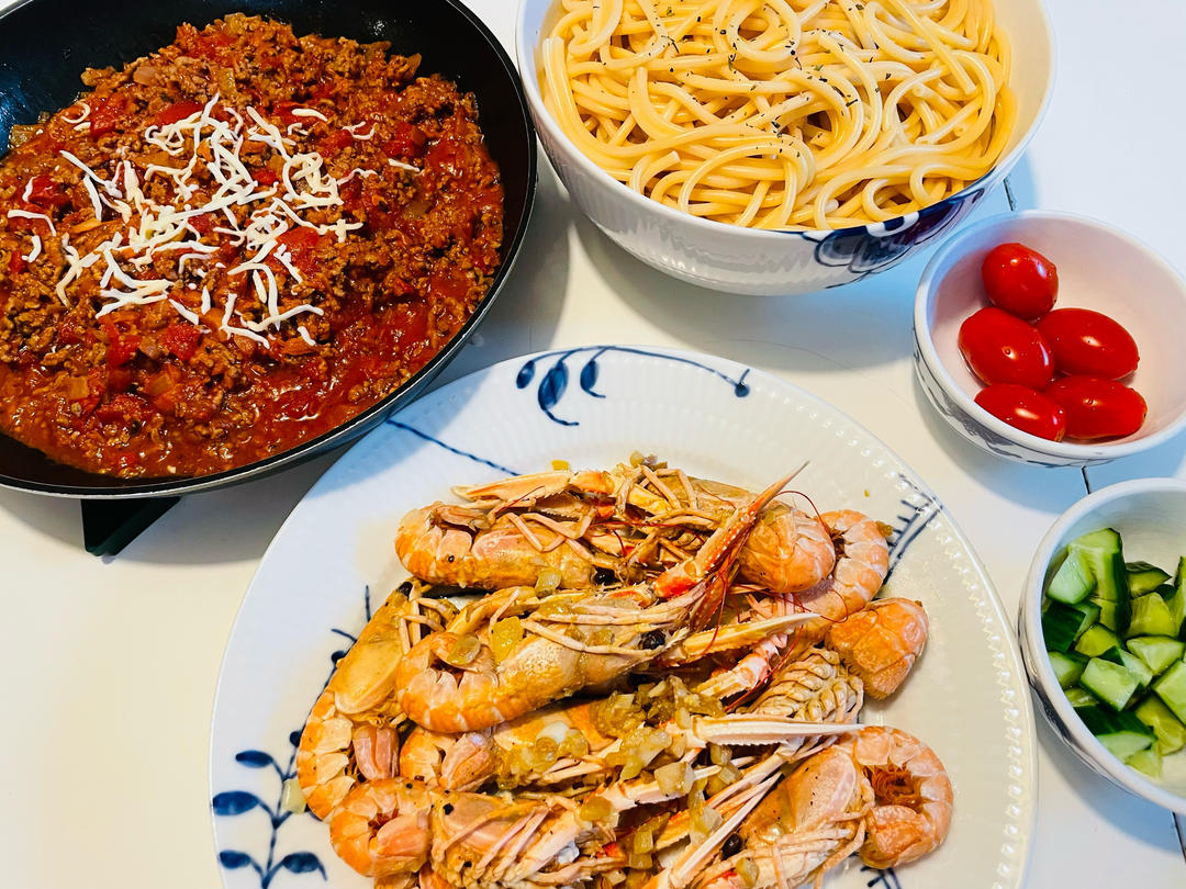 回家第一个晚餐,给老公和孩子们做他们喜欢吃的意大利面🍝,而我有小龙虾🦞😋!