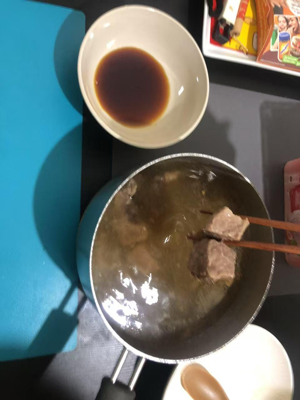 牛肉用粗盐腌制。没过冷水,先煮了一会儿,把血水过滤掉。没有冰糖,用白砂糖代替,和油一起炒,没有变色。加入大半个大蒜🧄、四...