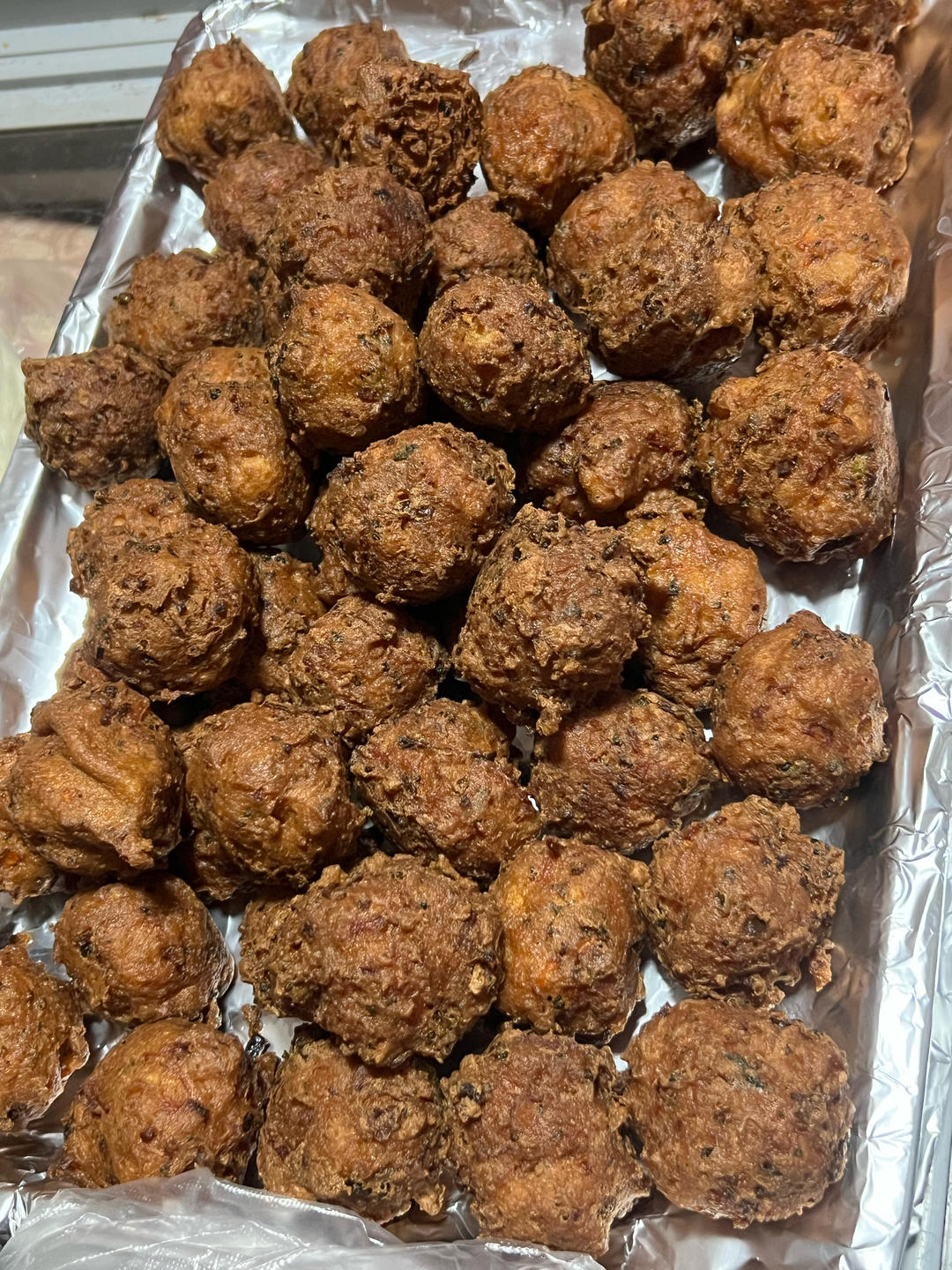 老公炸的丸子。里面有豆腐、胡萝卜、西兰花、火腿肠、鸡蛋、面粉。昨天下午又去了山东手造。