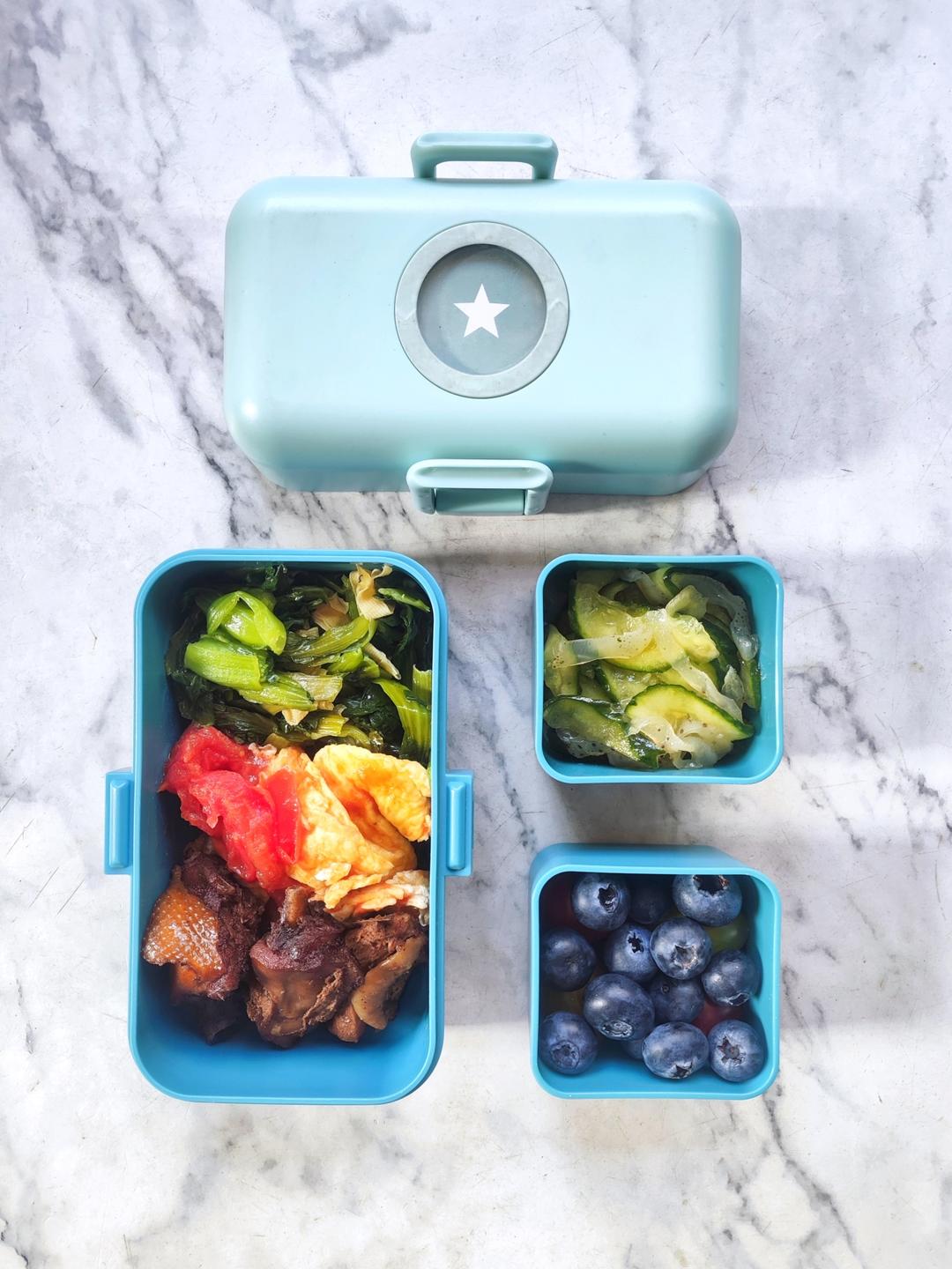 今日便当:炒青菜+番茄炒蛋+红烧鸡肉+海蜇头拌黄瓜+蓝莓小番茄~~