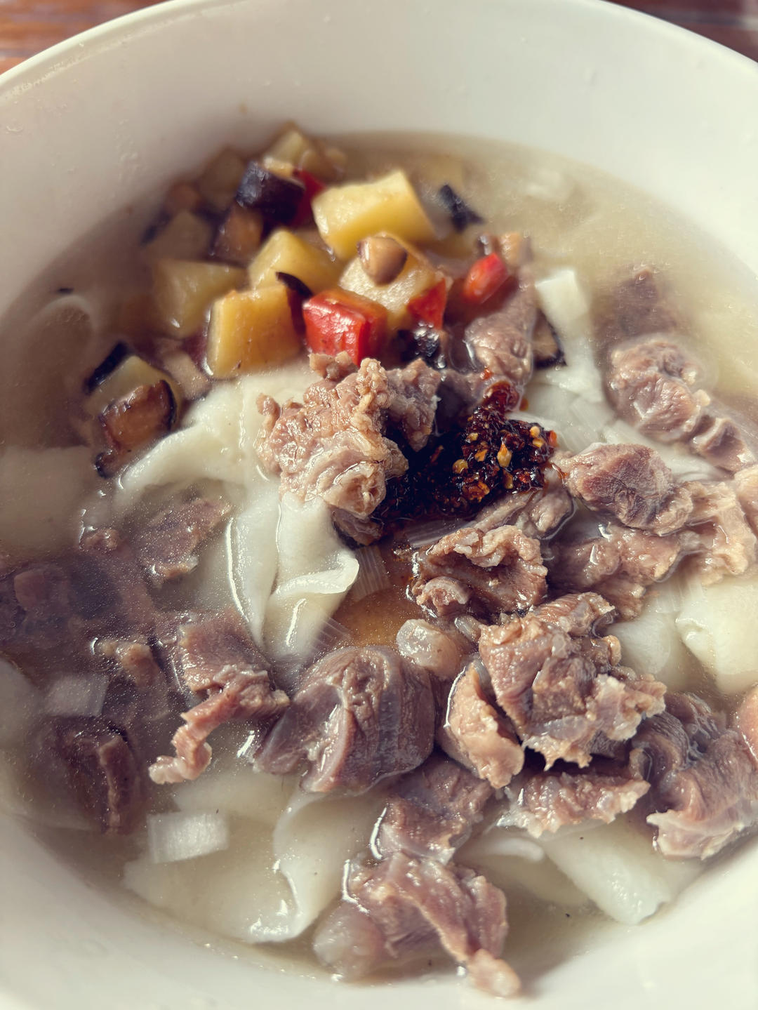 我们家这是清汤牛肉面的升级版,清汤牛肉加素臊子,手擀面,土豆胡萝...