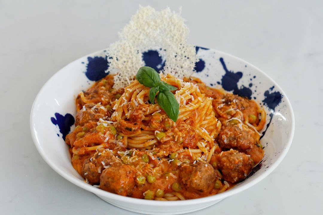 肉丸意面🍝,婆婆教我一个判断意面是否煮熟的小妙招,将一根意面摔到灶台墙上,没粘住就是没熟,拣回锅里继续煮😂,粘住了就是煮...
