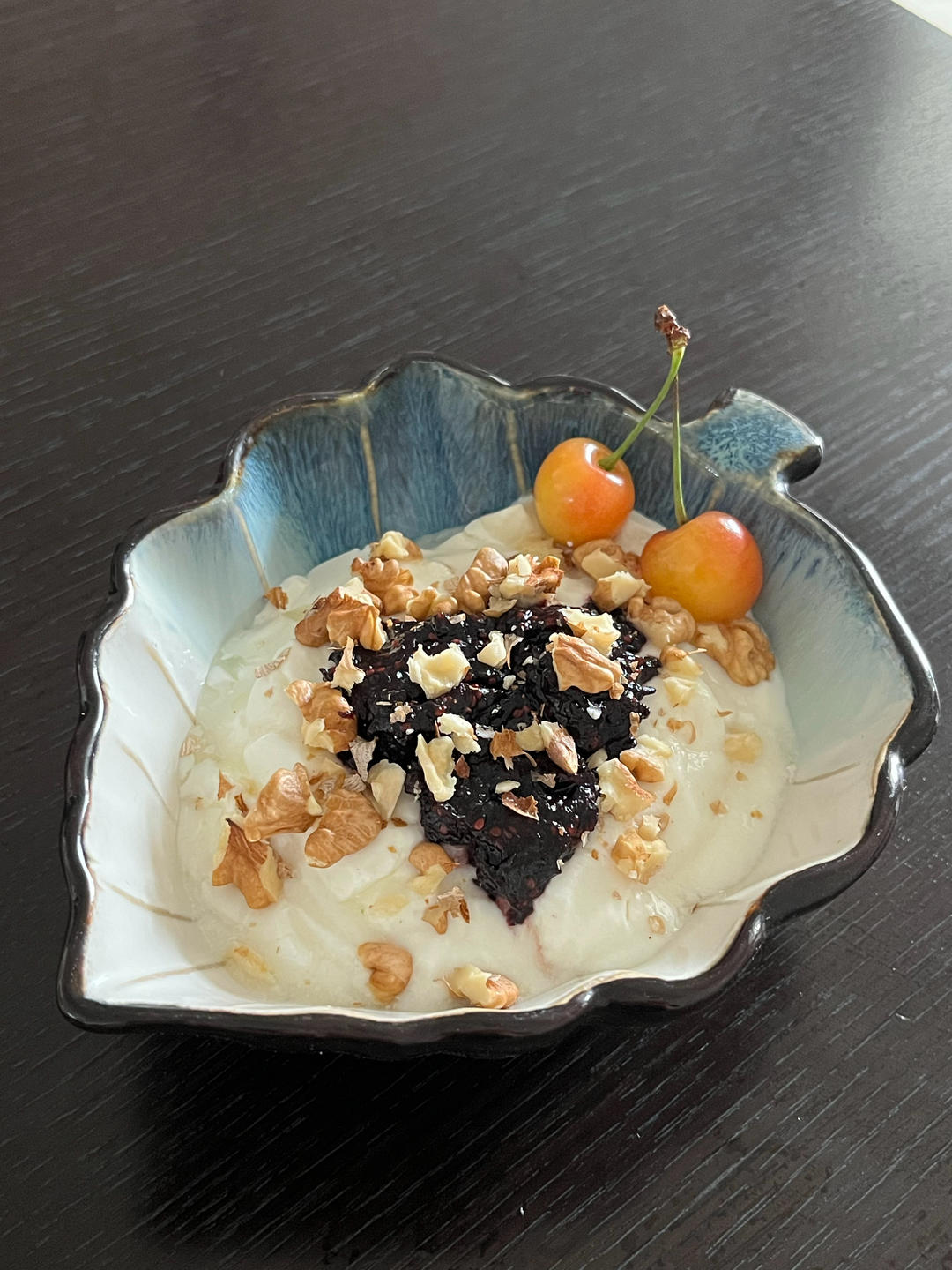 自制无糖酸奶加入自制桑葚果酱和核桃碎,核桃的颗粒感伴...