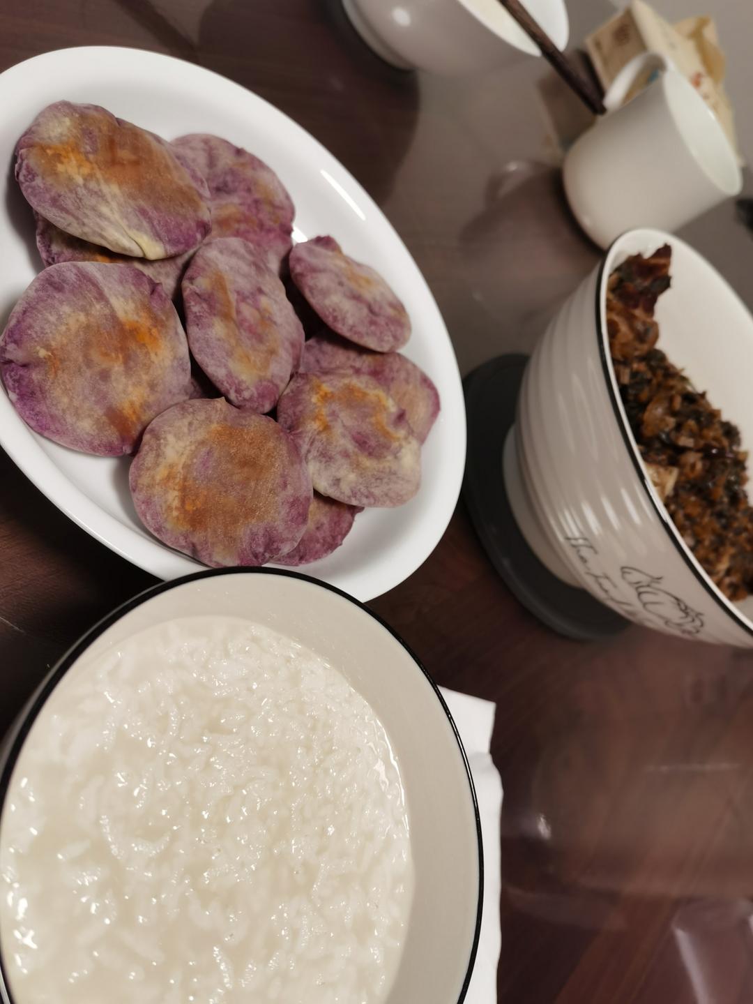 粥配饺子皮紫薯馅饼。 还好没加糖,加了大概5g的黑白淡奶,就这都不能吃多,会腻。烤箱180℃...