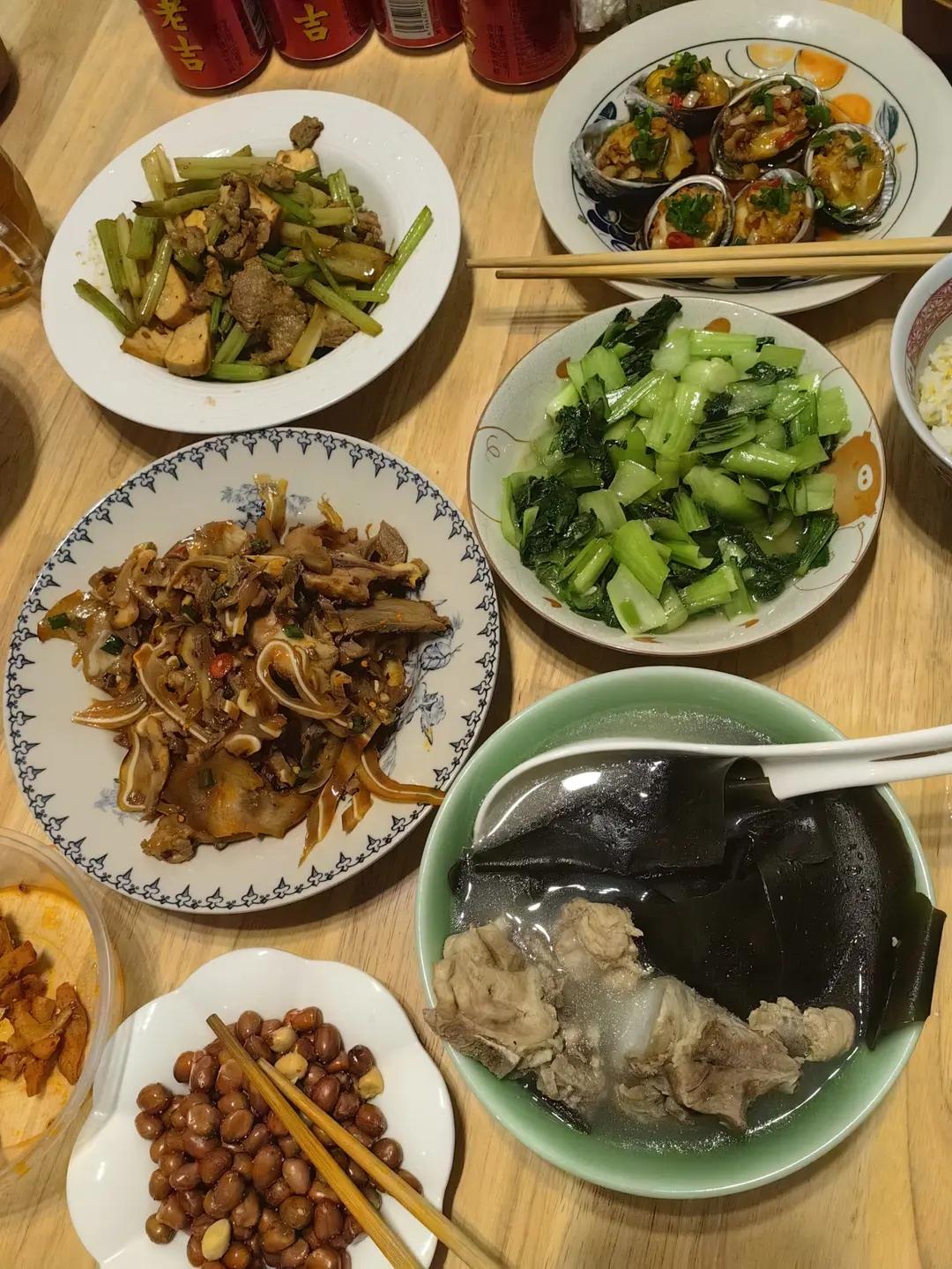 今天的晚饭,我妈来了,给她炒了她爱吃的芹菜,鲍鱼和骨头汤。