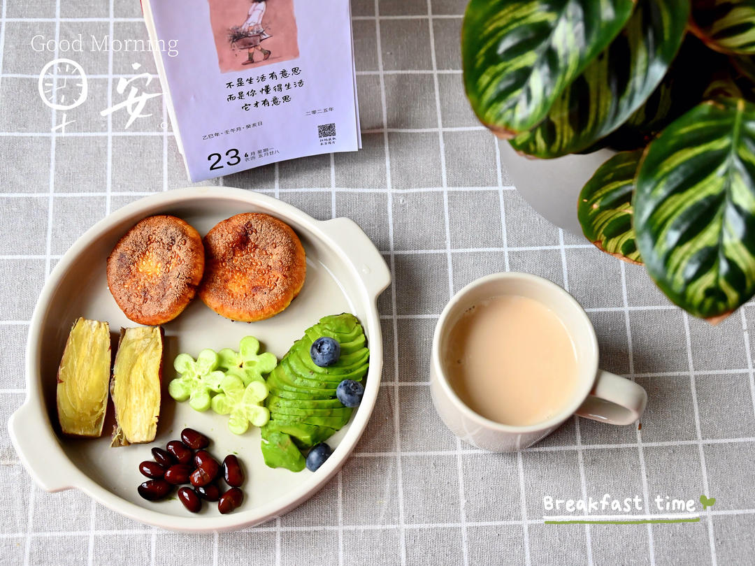 南瓜饼+红薯🍠+牛油果🥑黄瓜🥒+醋泡黑豆+拿铁☕️