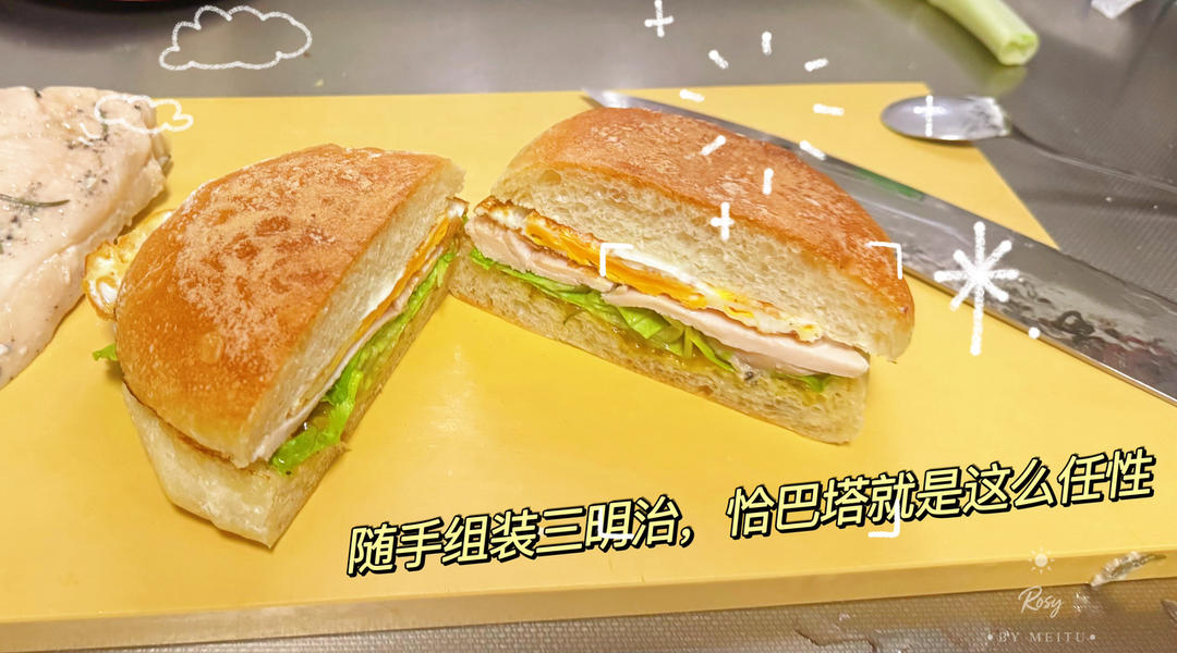 低温鸡胸肉,炒蛋,生菜,酸黄瓜沙拉酱组装的三明治