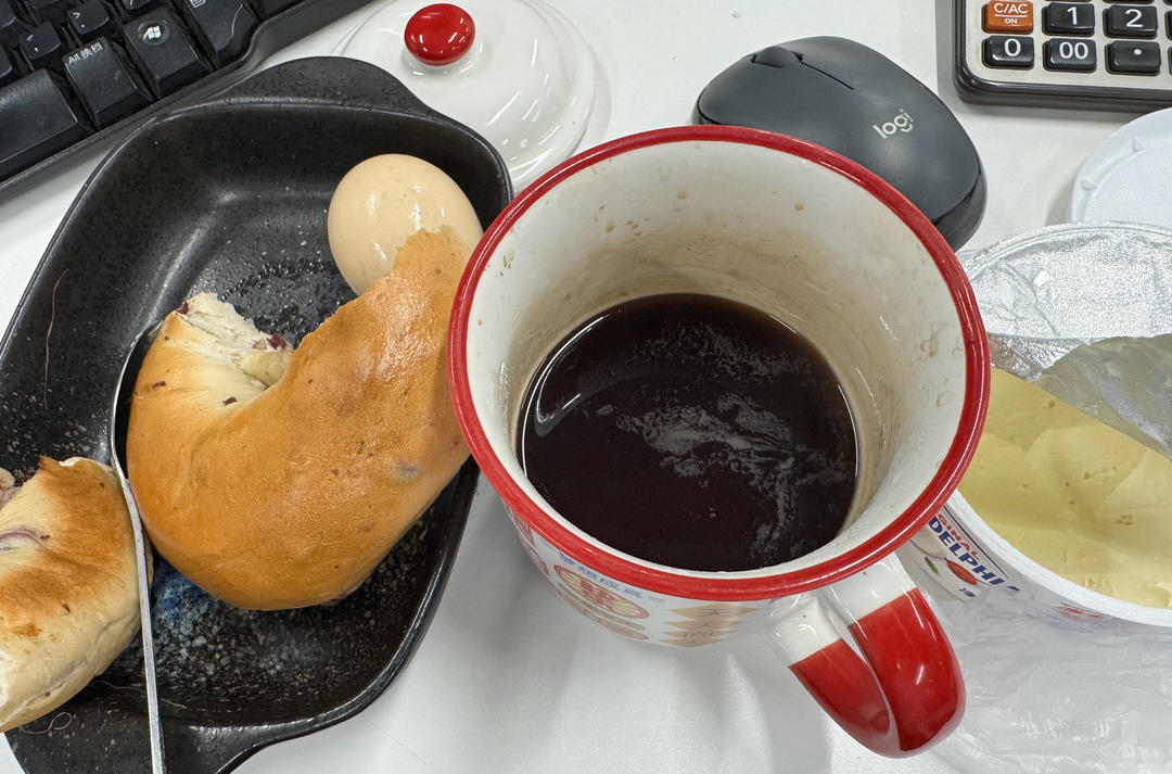 黑咖(现在可以适应不加奶)、贝果(奶酪)、鸡蛋