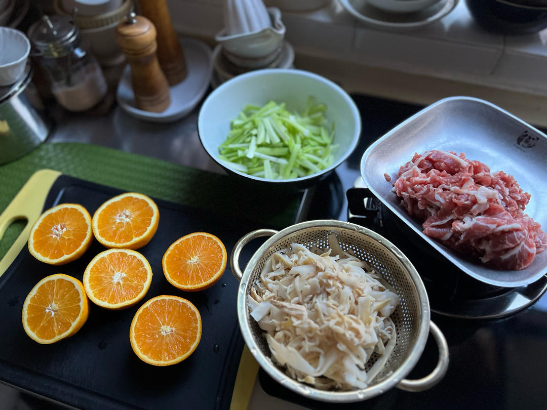 🍊鸭舌、橙汁、韭黄笋子炒肉、烧辣椒白米饭。