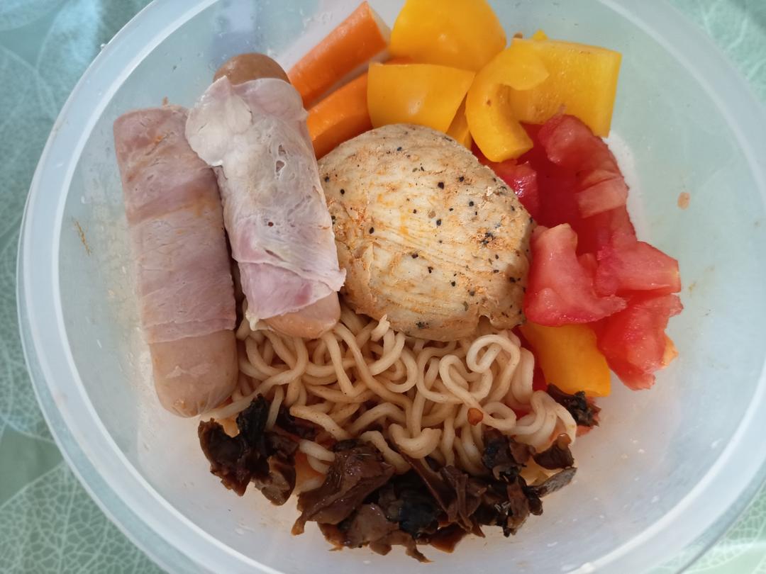 炒鸡好吃!!加了紫菜,鸡蛋,胡萝卜,鸡肉肠,还有之前剩的一点青豆芽菜肉沫也放进去了。最后...