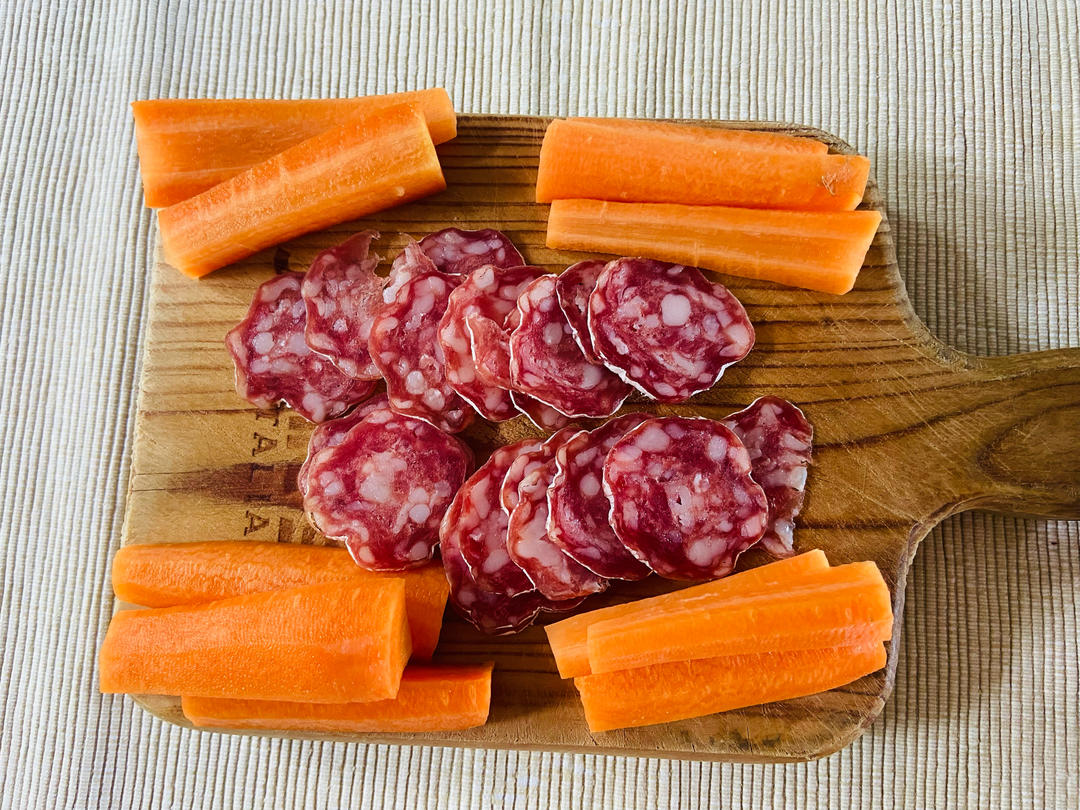 晚餐是急就章。出門耍,回來晚。我自己切了點蘇拉米腸配胡蘿蔔,先生吃豬肉酥皮。