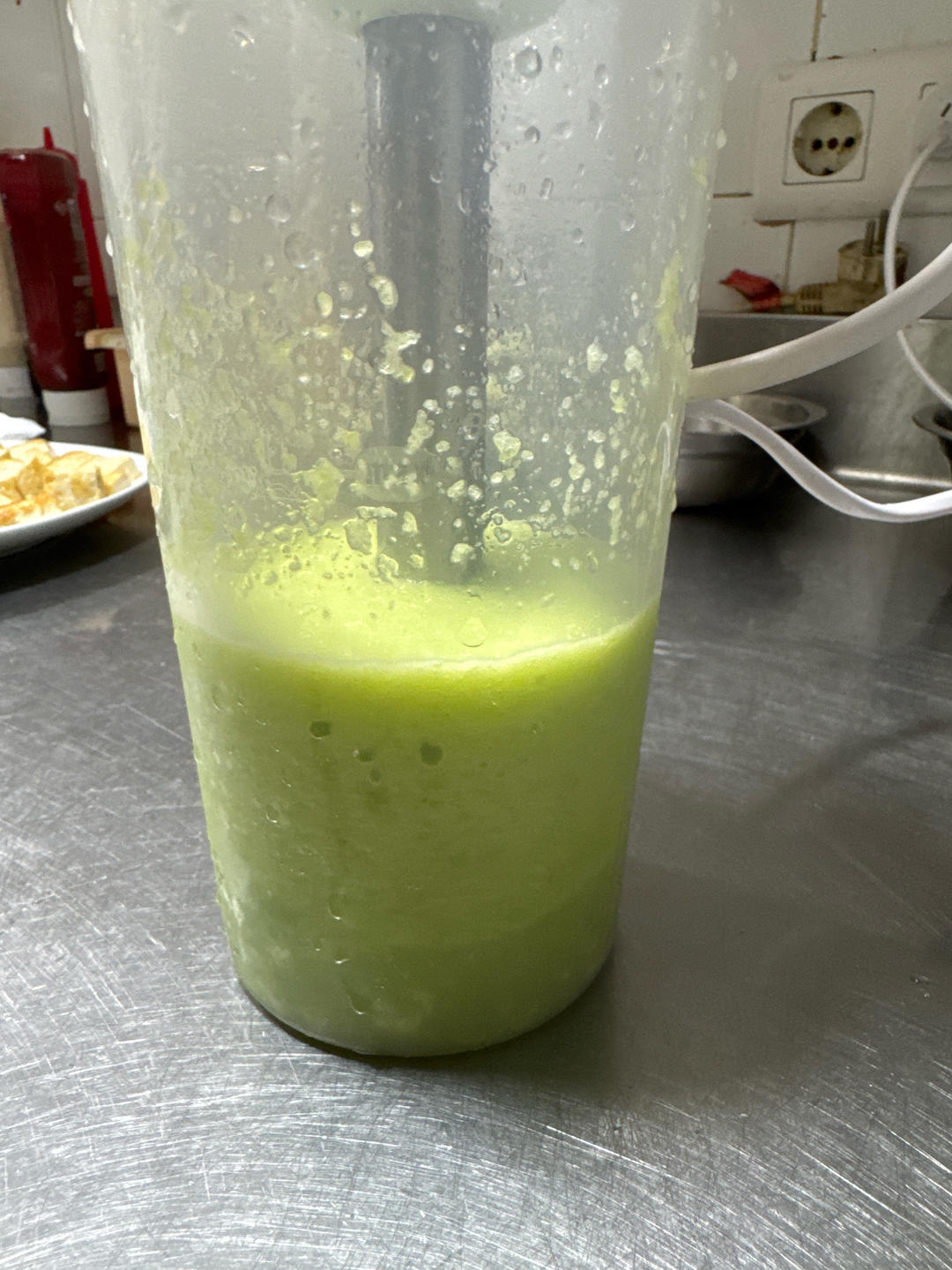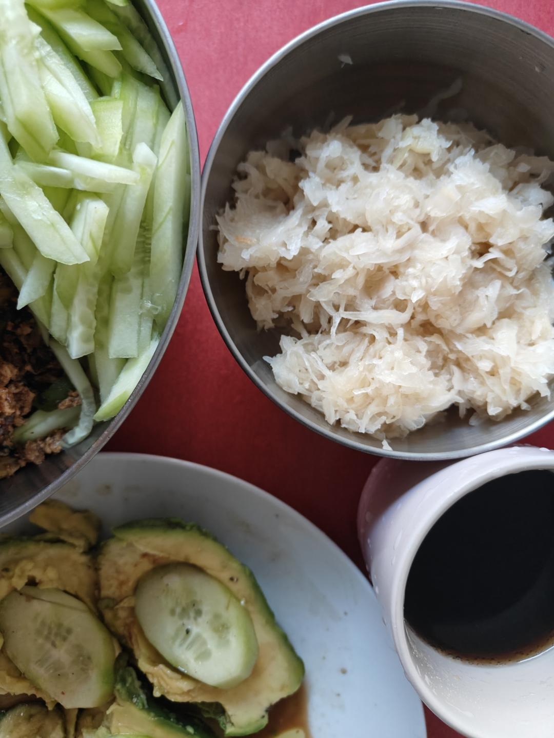 橄榄油小葱鸡蛋青椒大料酱油炸酱拌生菜黄瓜意面+粉盐橄榄油巴斯克醋配牛油果黄瓜片+德式酸菜