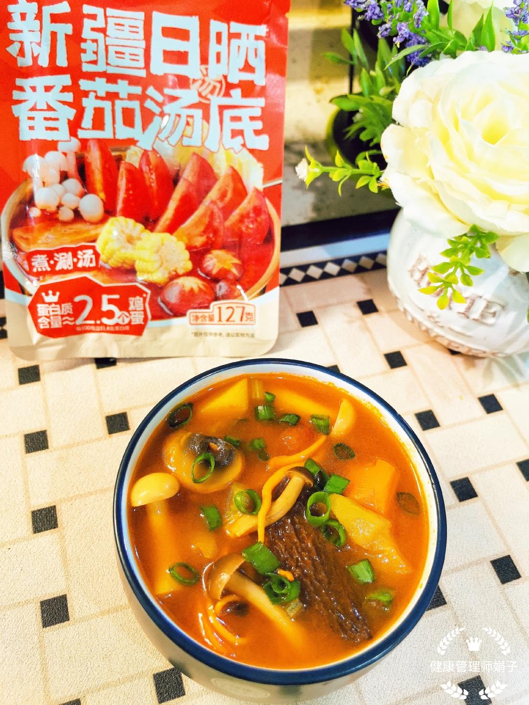 今晚用。老汤坊的番茄汤底料包做了番茄菌菇蔬菜汤,一锅汤里...