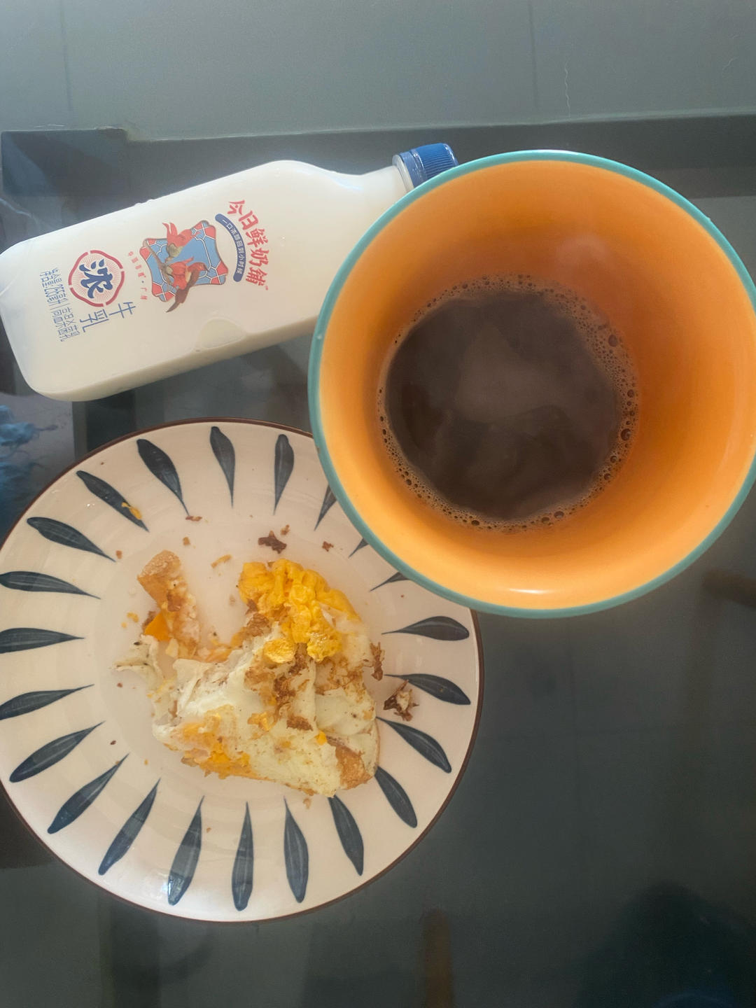 早: 牛奶,蛋2, 黑咖啡