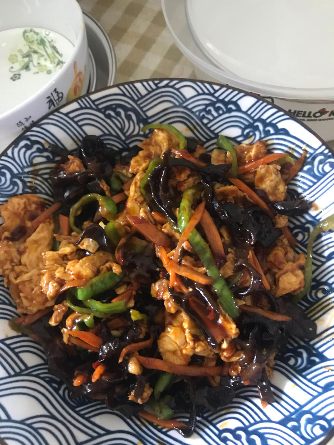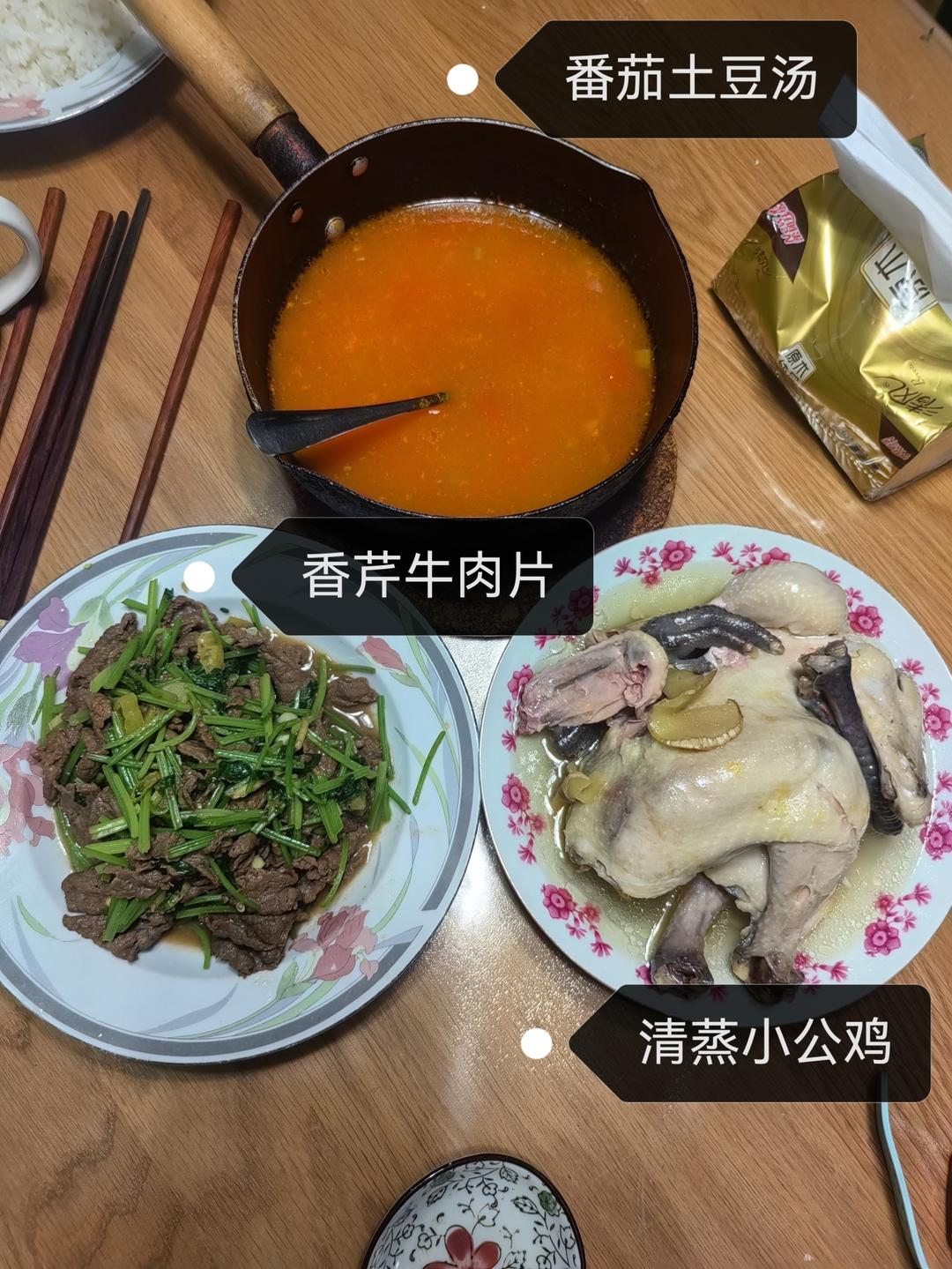 土豆烧鸡块、平菇粉条鸡汤;凉拌豆皮