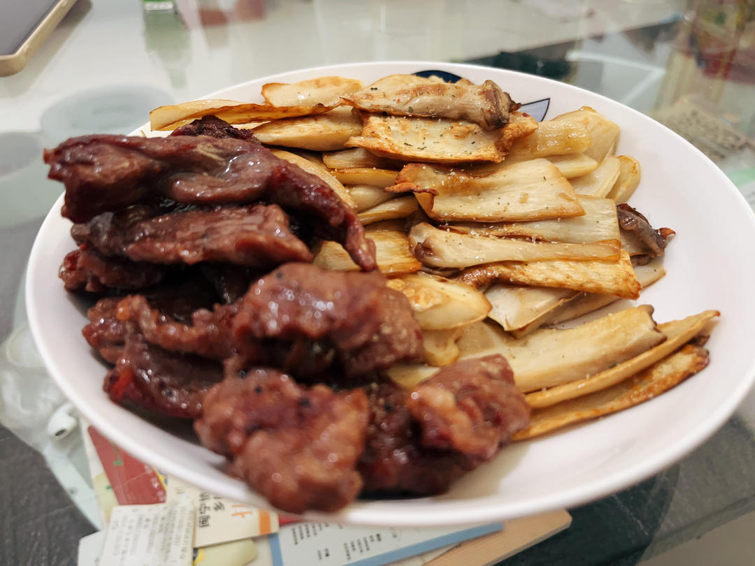 杏鲍菇煎一煎,伪松茸,还滑了一点牛肉😋